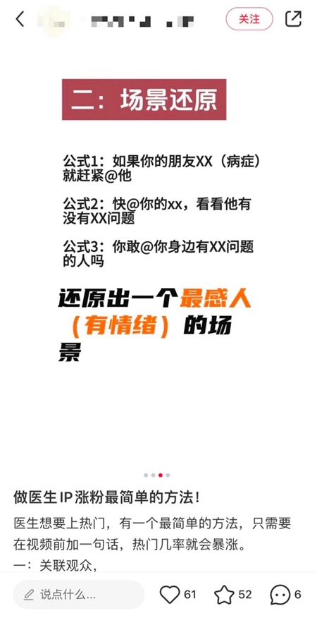 中青报·中青网记者发现,有的“网红医生”背后有专门的“操作”团队,平台上活跃着一些新媒体运营师,为医疗科普号增加流量“支招儿”。一位平台描述为专注医疗流量变现的MCN机构创始人在视频中声称,想做爆款视频,要根据自身专业,寻找10个流量做得好的同类IP,从他们的内容中梳理出最火的20个视频,进行1∶1翻拍。诸如此类的“起号攻略”在平台上颇受追捧。