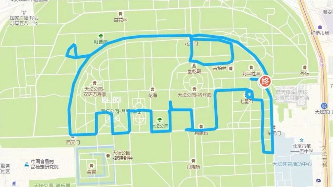 上午10时许,徒步活动正式开始,大家从西天门出发,穿越百花园、月季园、祈年门、七星石、东天门、北天门,再返回西天门,用脚步勾勒出一只憨态可掬的“大象”。据了解,这条徒步路线全长5.2公里,是中轴线历史文化遗产与现代生活的生动结合,已成为天坛的网红健身路线。