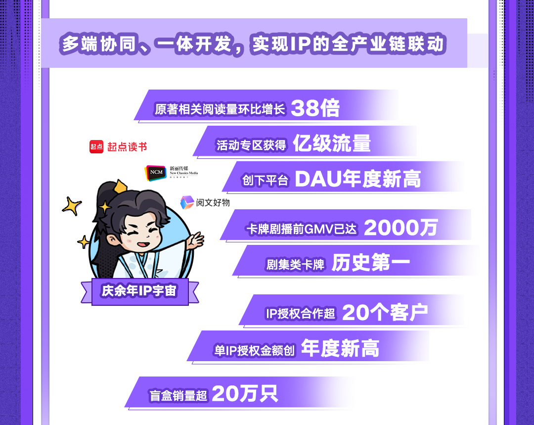 作为文娱产业“爆款制造机”,上半年阅文除了《热辣滚烫》《与凤行》《庆余年第二季》《玫瑰的故事》四部影视爆款作品,还在卡牌、短剧等业态上迈上新台阶。