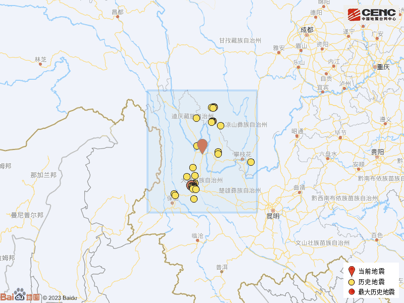 历史地震:根据中国地震台网速报目录,震中周边200公里内近5年来发生3级以上地震共130次,最大地震是2021年5月21日在云南大理州漾濞县发生的6.4级地震(距离本次震中137公里),按震级大小前50次历史地震分布如图。