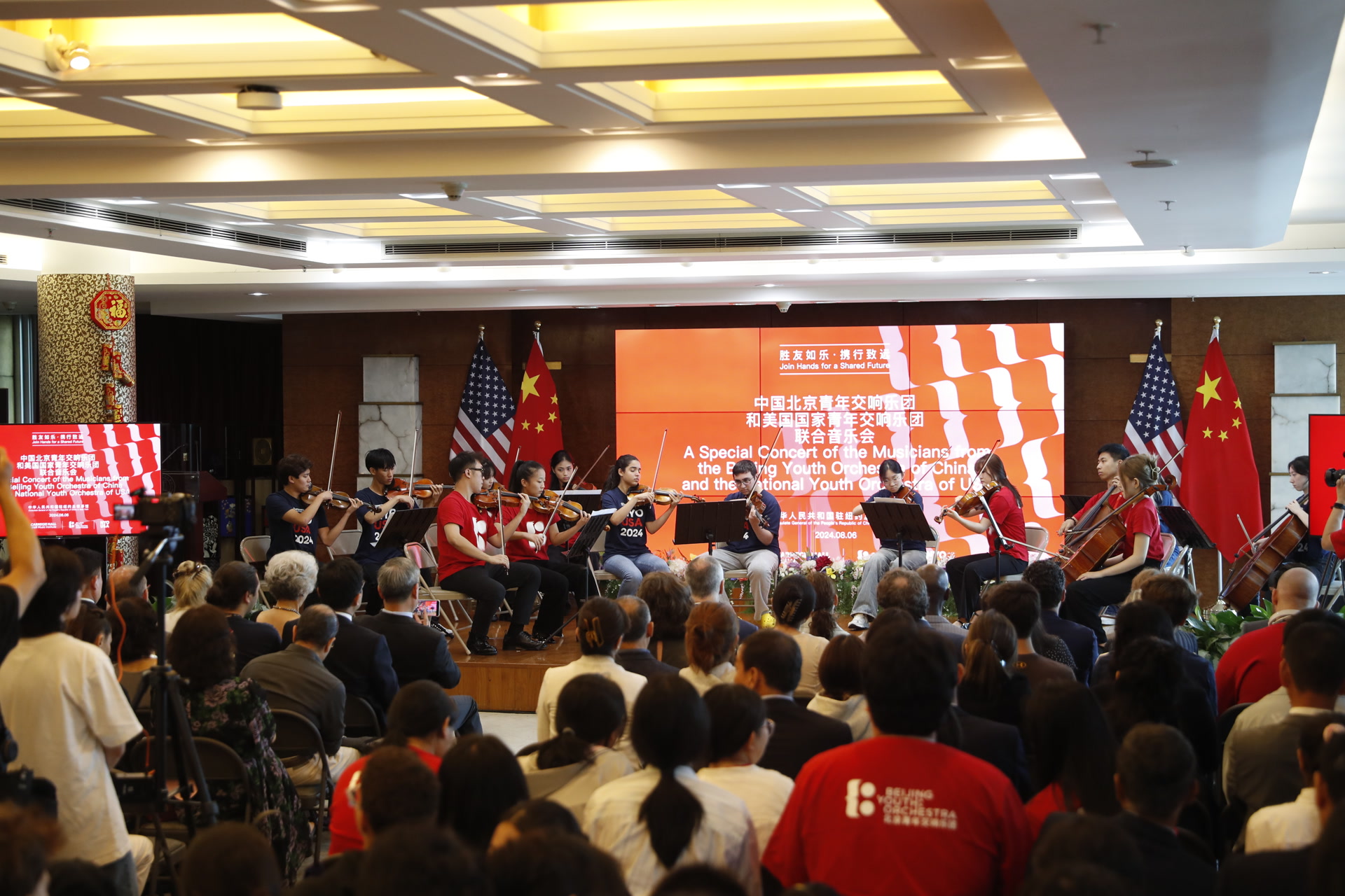 “我和你,心连心,永远一家人”,《我和你》承载的奥运记忆与大同理想总是令人动容。日前,这段经过弦乐重奏改编的旋律回响于中国驻纽约总领馆,为“胜友如乐 携行致远”中国北京青年交响乐团与美国国家青年交响乐团联合音乐会圆满作结。至此,北京青年交响乐团受邀赴美参加首届“WOW!世界青年管弦乐团周”演出及系列文化交流活动收官,近130位乐手以乐会友,在世界舞台上展现了新时代中国青年的朝气、自信、开放。