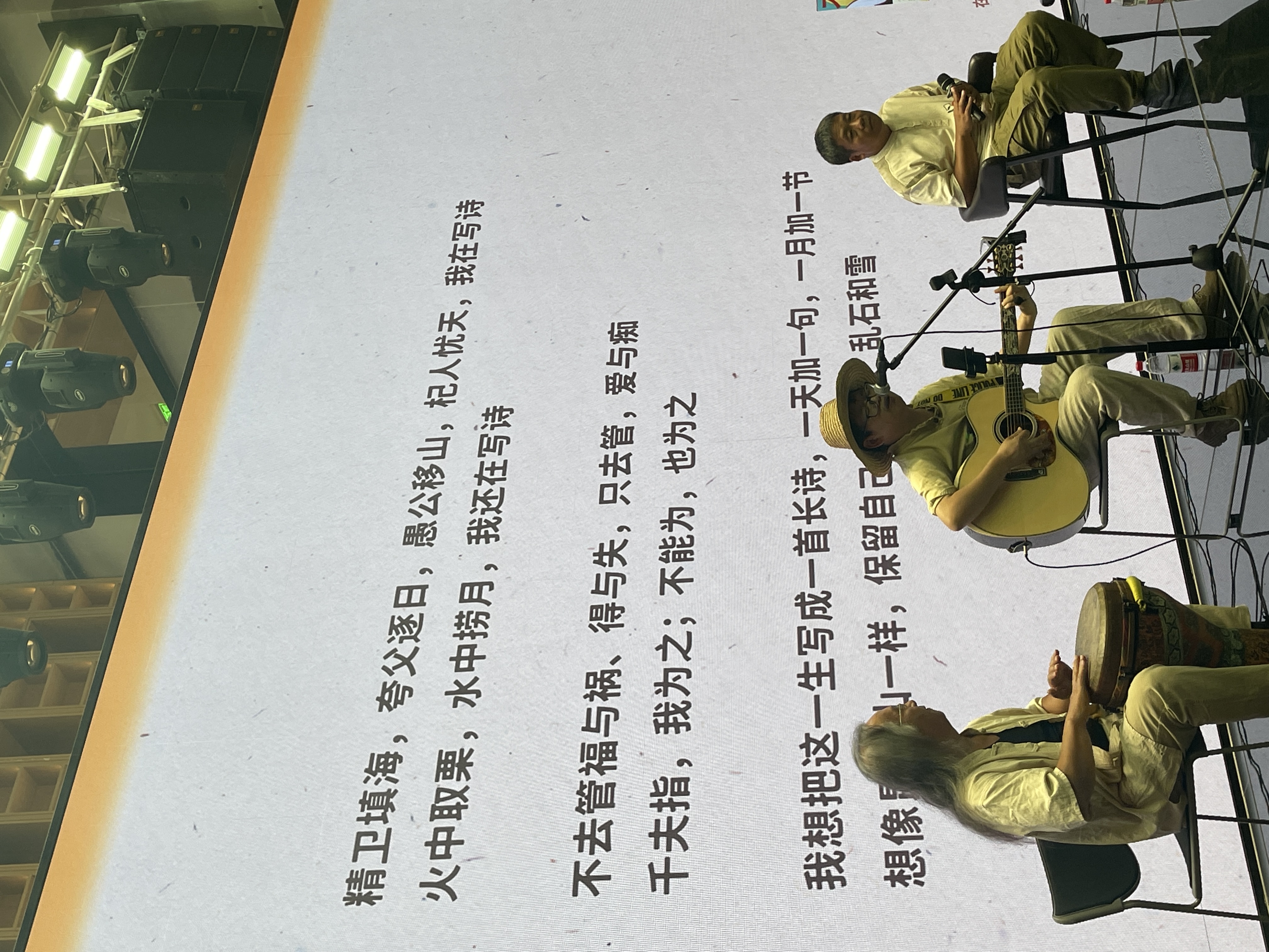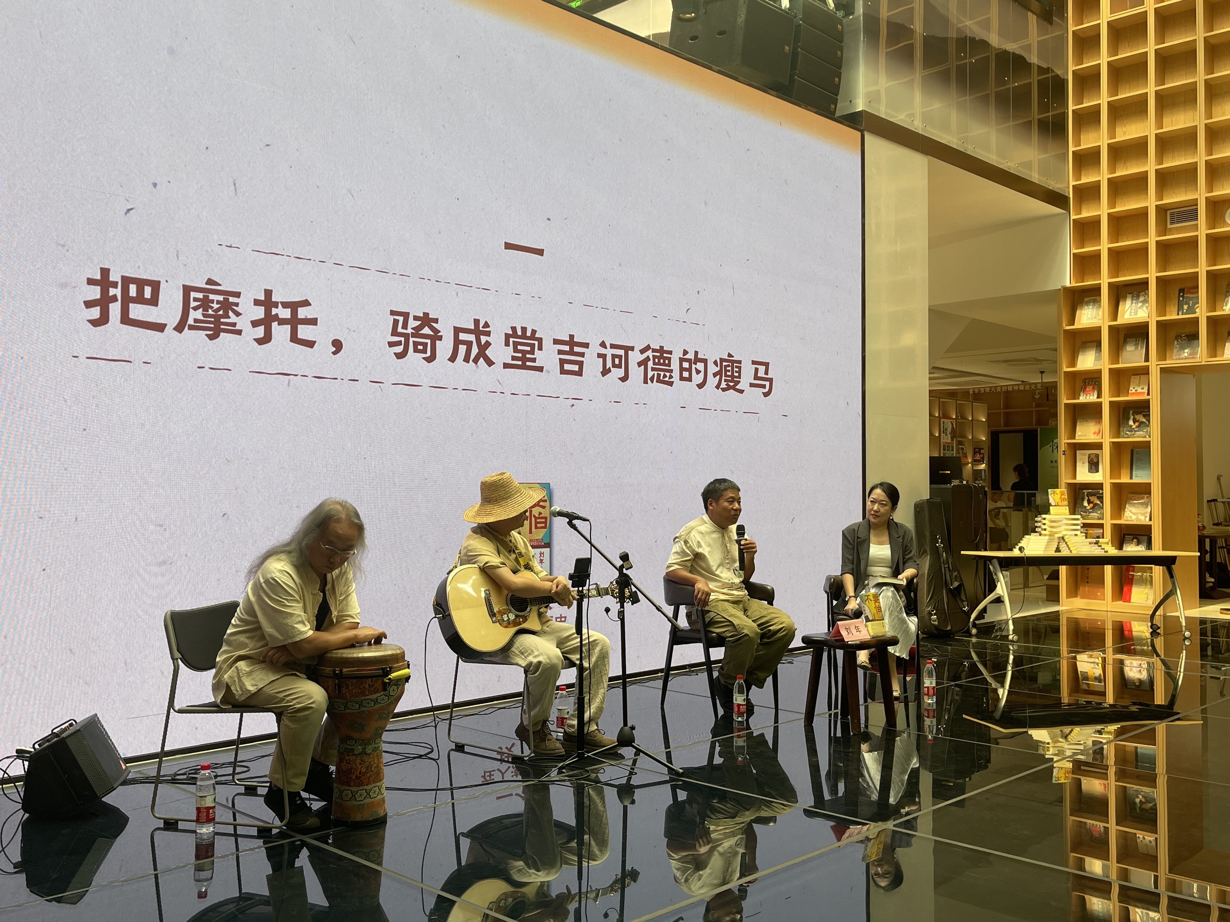 8月16日下午,行吟诗人刘年携首部非虚构作品集《不要怕》来到上海书城福州路店做读者分享,他现场讲述了写作《不要怕》的心路历程,分享了十余年间北漂的经历、独自摩托车旅行的感受、诗歌对生命的意义以及与儿子相处的日常。在讲述的过程中,半亩方塘行吟乐队穿插演唱刘年多首诗作,这些诗作携带着湘西泥土和露水气息,真诚质朴,直击人心,感动全场。