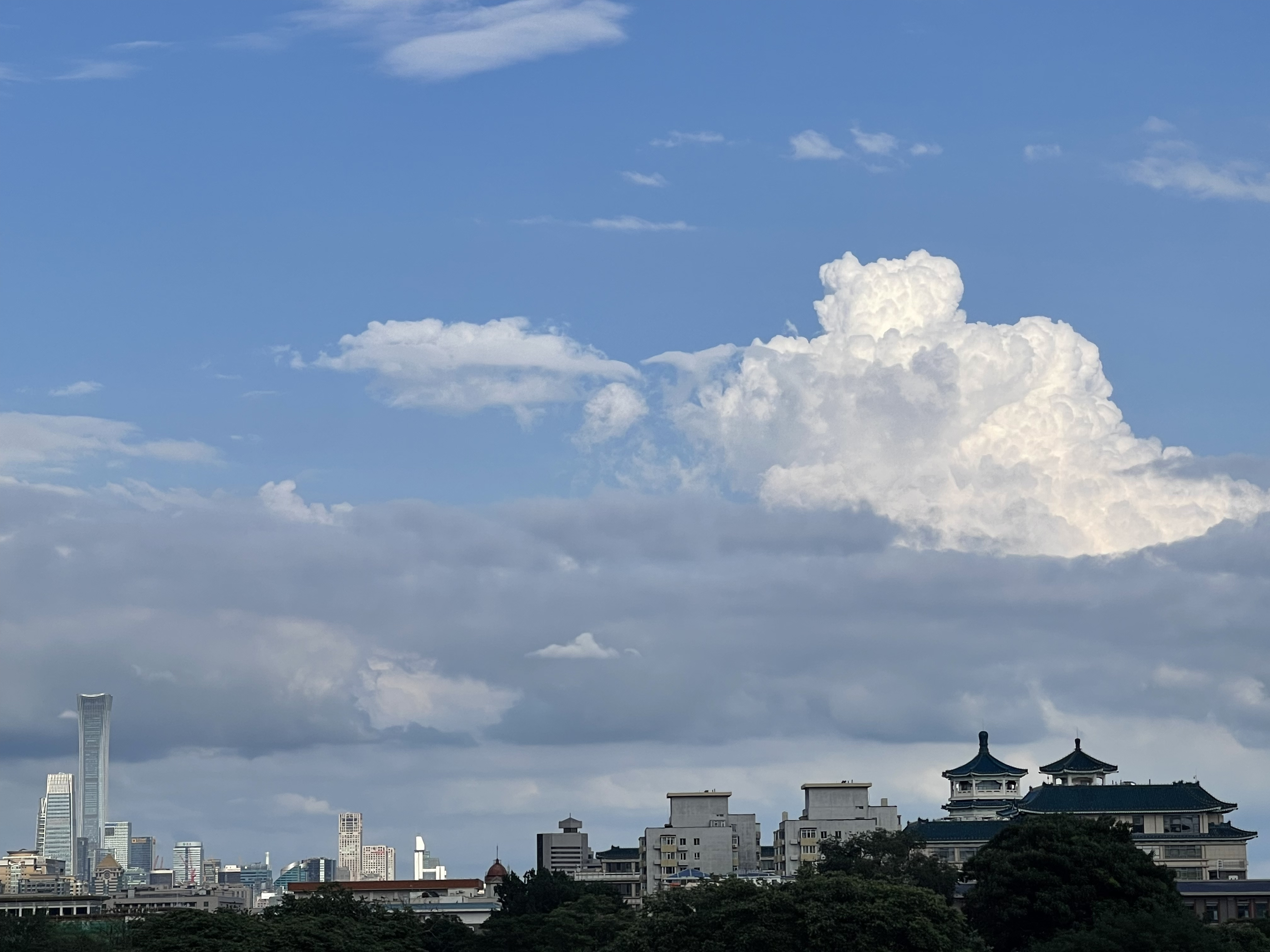 8月20日,北京出现分散性阵雨天气。雨后初霁,京城上空的云层如同洁白的棉花糖,在蓝天的映衬下,层次分明,显得格外梦幻。傍晚,一缕缕阳光穿过云层,仿佛一幅天工绘制的画卷。许多市民纷纷拿起手机,记录下这短暂却美好的瞬间。