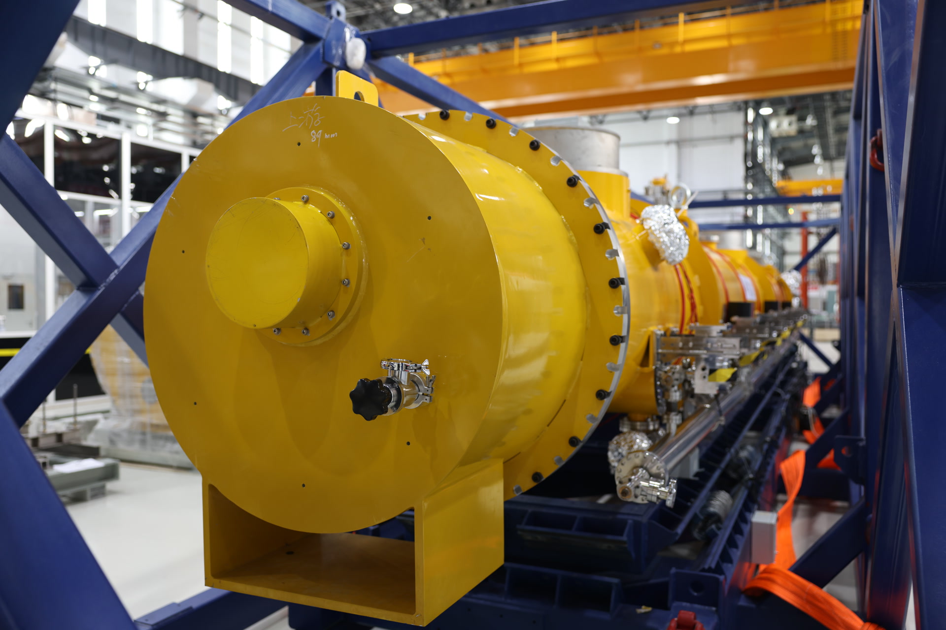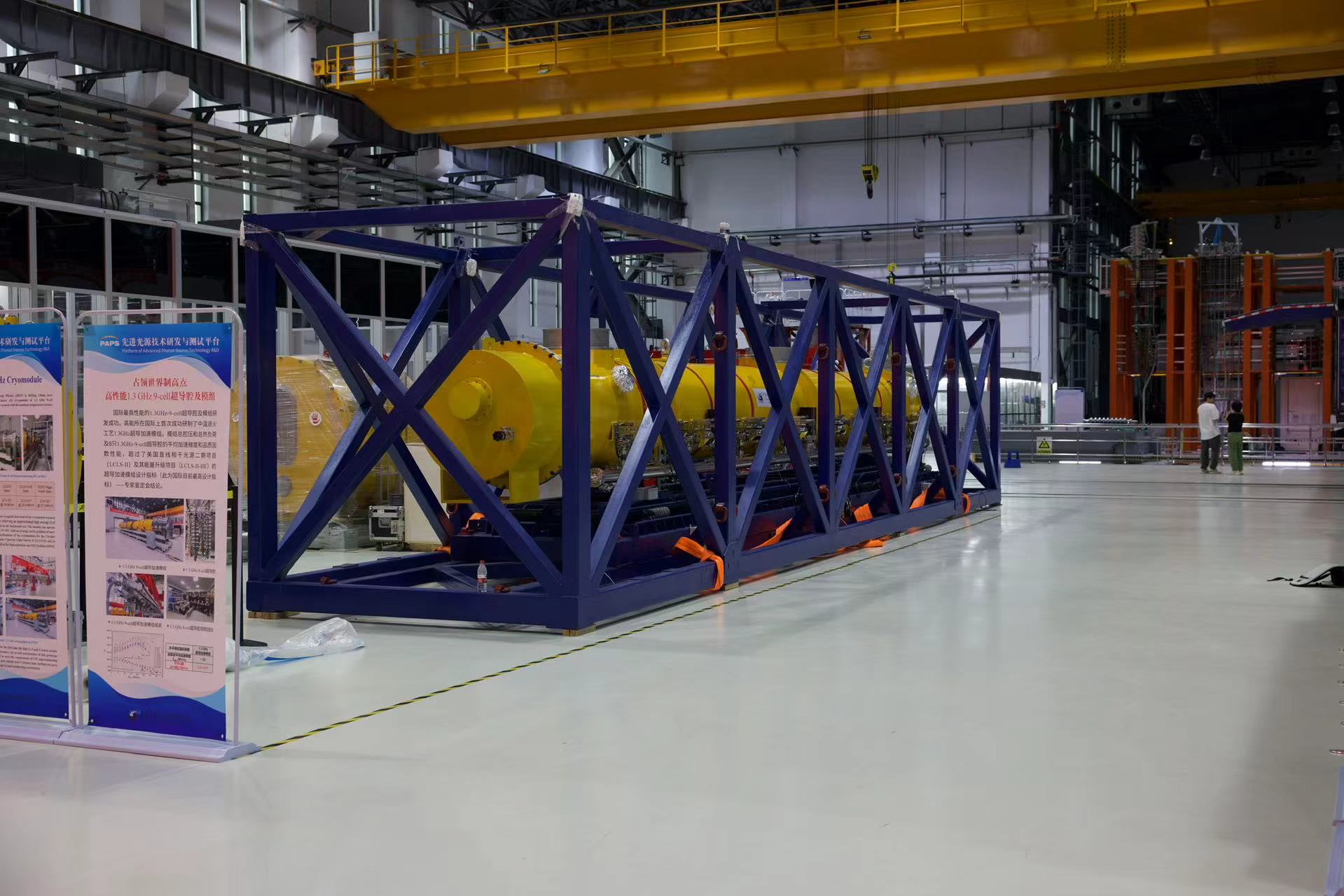 1.3 GHz 9-cell超导加速模组总长度12米,由8只1.3 GHz 9-cell超导腔在一个恒温器内串联组成,在国内是首次进行远距离运输,涉及到复杂的吊装工艺和保护等准备,前期已经过多次样机运输试验。