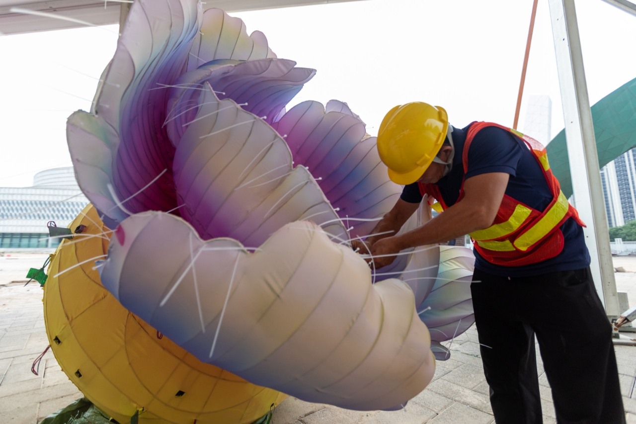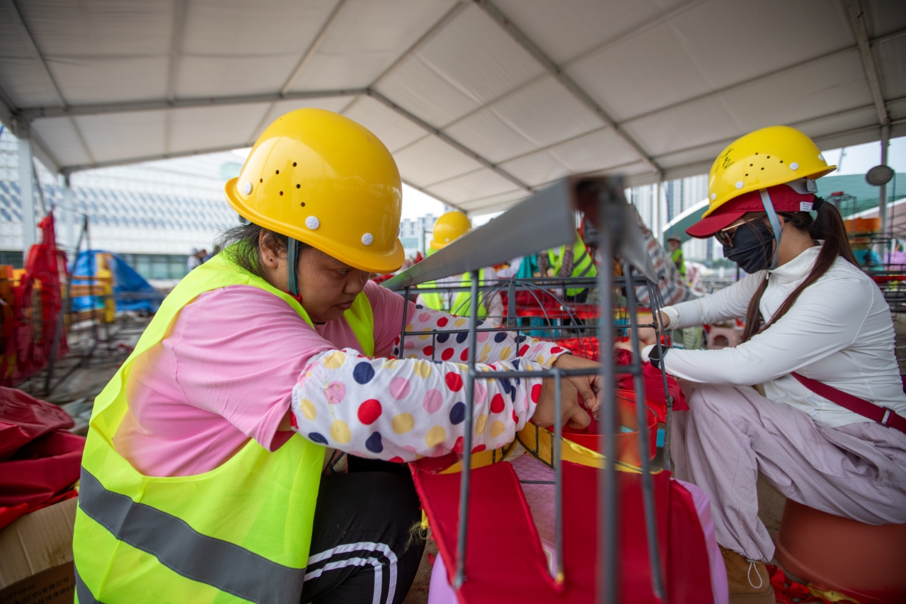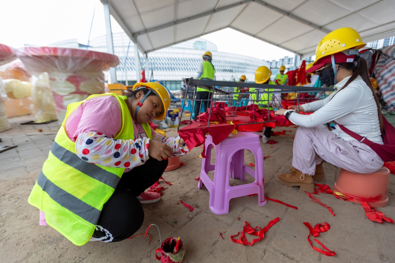 施工现场不仅有机械轰鸣,在团圆宫灯的制作场地中,来自四川自贡的彩灯工匠们分工明确、互相配合,娴熟地制作着一盏盏彩灯:钳工首先将彩灯骨架拼接完成并进行防锈处理,随后由裱糊工通过剪裁,将各种色彩的专业色丁布贴合在彩灯骨架上。“裱糊工艺比较复杂,像现在正在做的这种叫暗花,通过灯面造型起伏来展现层次感,并不是简单粘在平面灯架上就行了,要表现出各种立体造型。”京彩灯会的艺术总监、自贡市美术家协会主席杨勇向记者介绍。