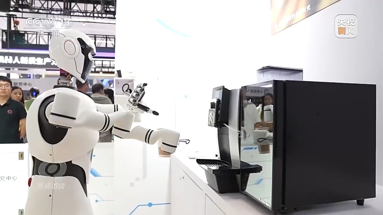 在一家“咖啡馆”,记者看到两个“服务员”正在这里忙碌着,它们一个负责在前台收银,一个负责在后厨制作。记者点了一杯卡布奇诺,几分钟后,一杯香浓的咖啡就被递到了记者面前。喝完咖啡,记者接着和两个“服务员”的同伴进行了一场射箭比赛,没想到的是机器人把把都打出了八环,轻轻松松就打败了记者。