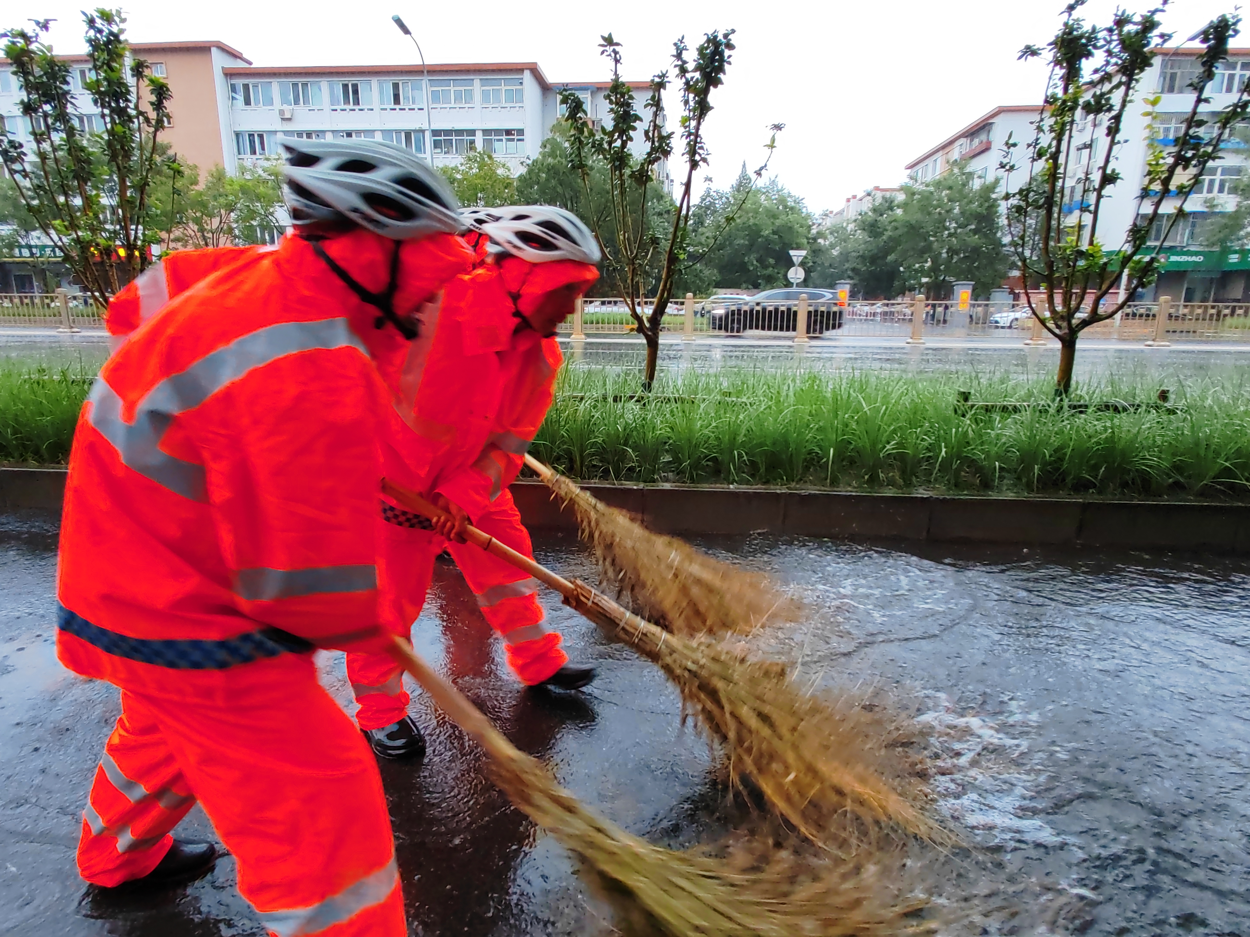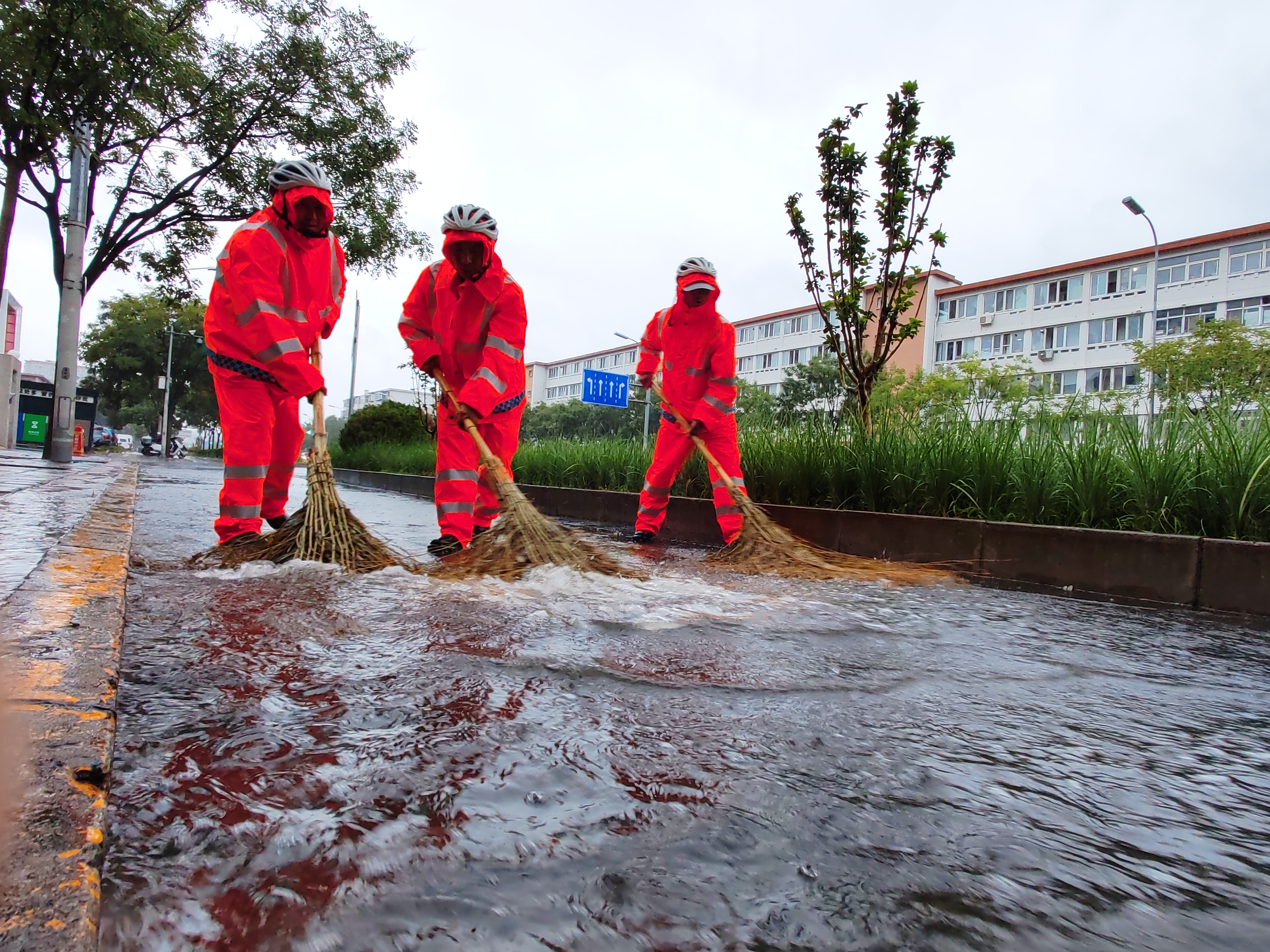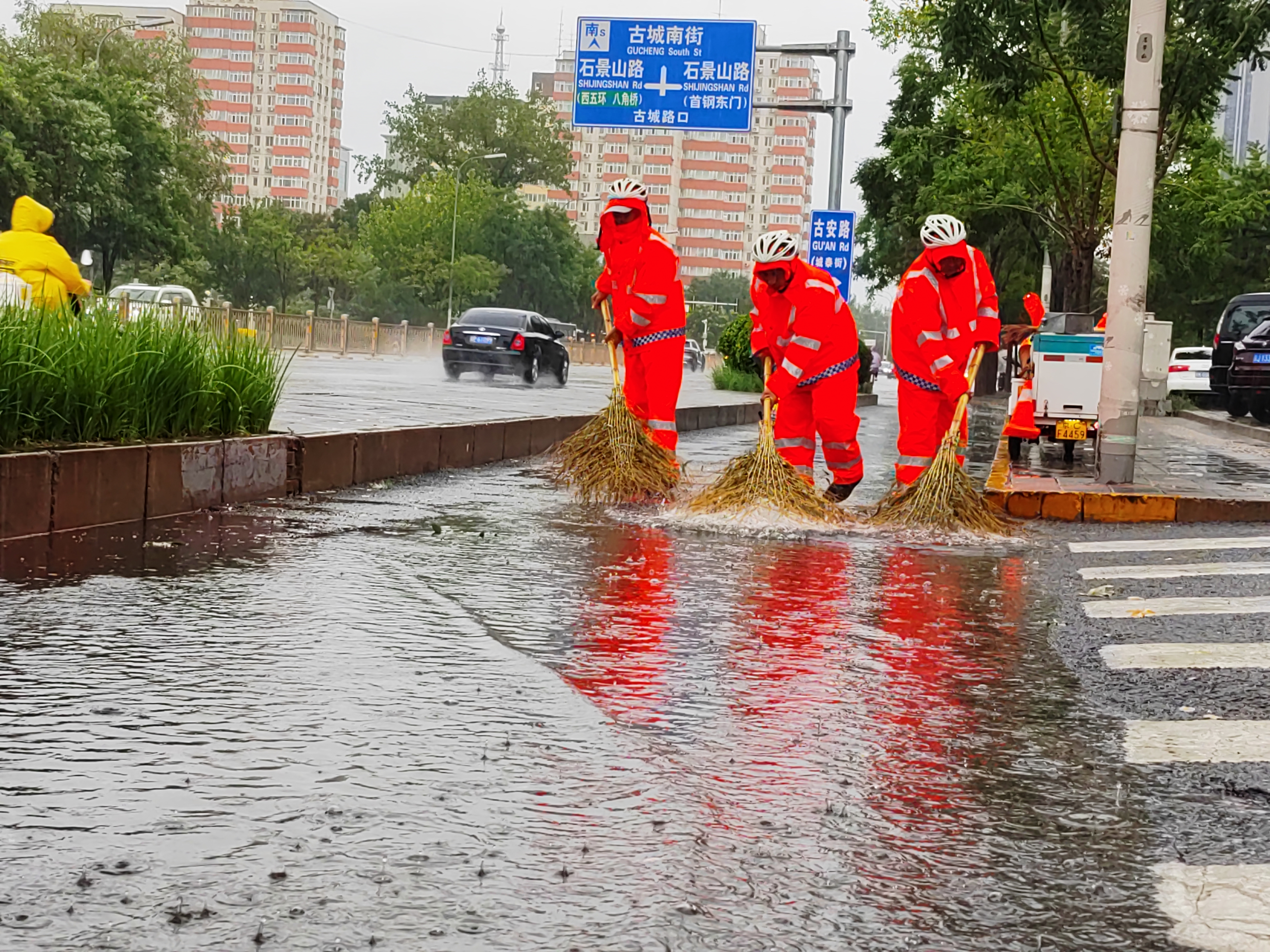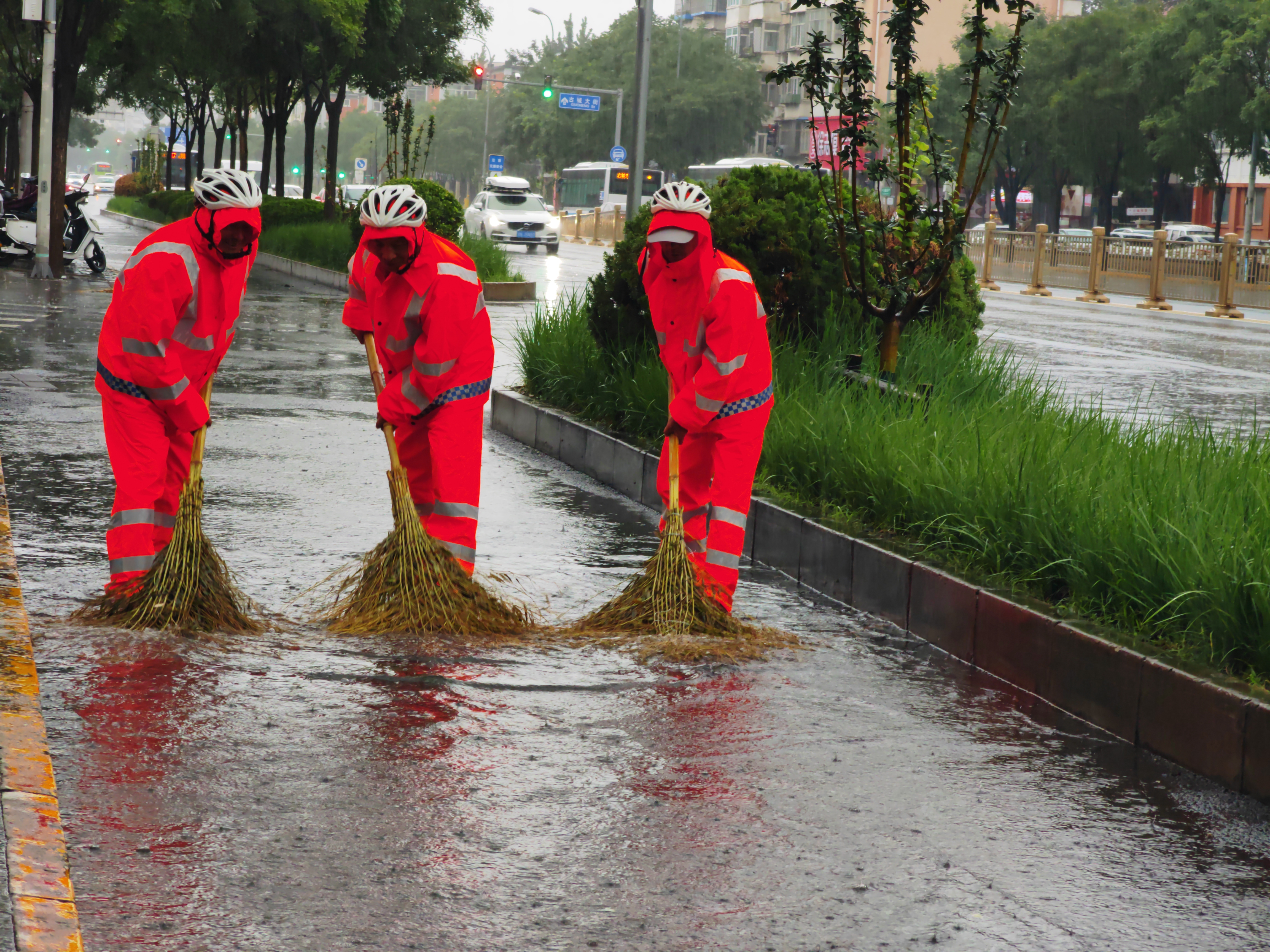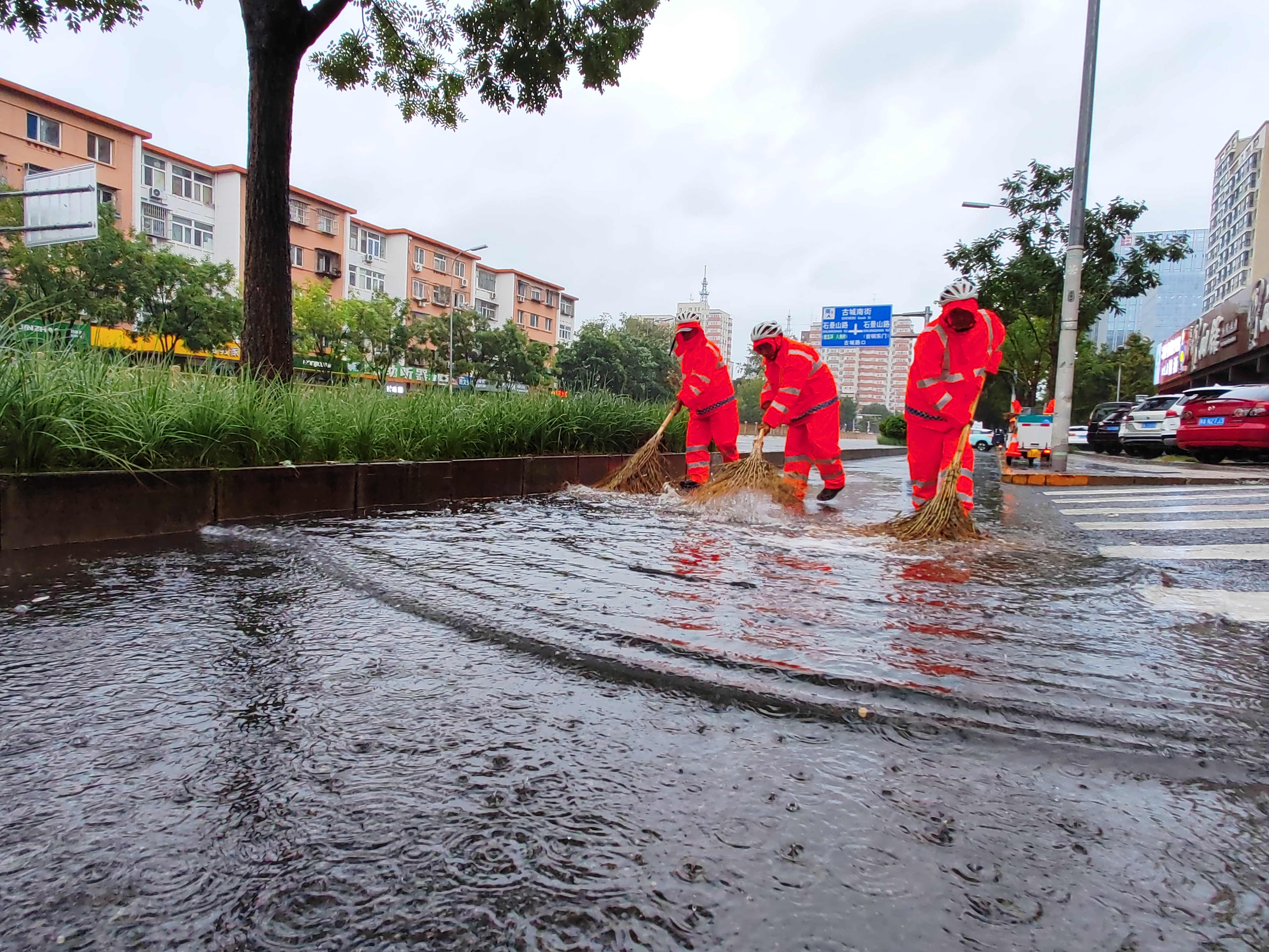 8月26日清晨,在石景山区古城大街,三名环卫工人冒雨清理辅路上的积水,保障居民正常生活与出行。