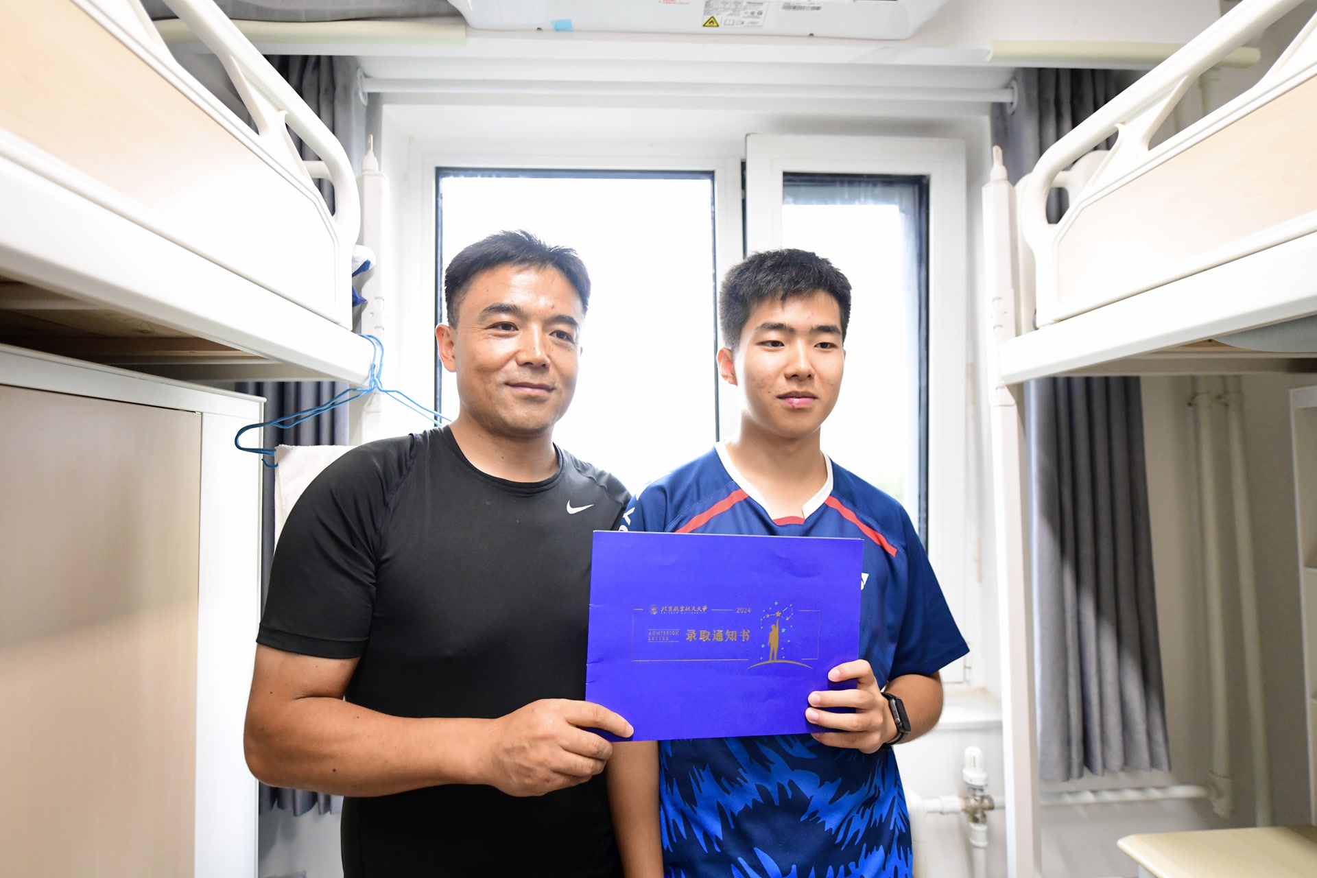 迎新日遇上降雨,新生们报到手续改在宿舍办理。北航大运村学生公寓里,47岁的刘建波帮儿子收拾行李,还贴心地把录取通知书摆在了书桌上。今年,父子俩一同踏入高考考场,分别获得了梦想大学的录取通知书——刘傲寒以青海省理工类第64名的好成绩考入北航未来空天领军计划,父亲刘建波被广西师范大学汉语言文学专业录取。