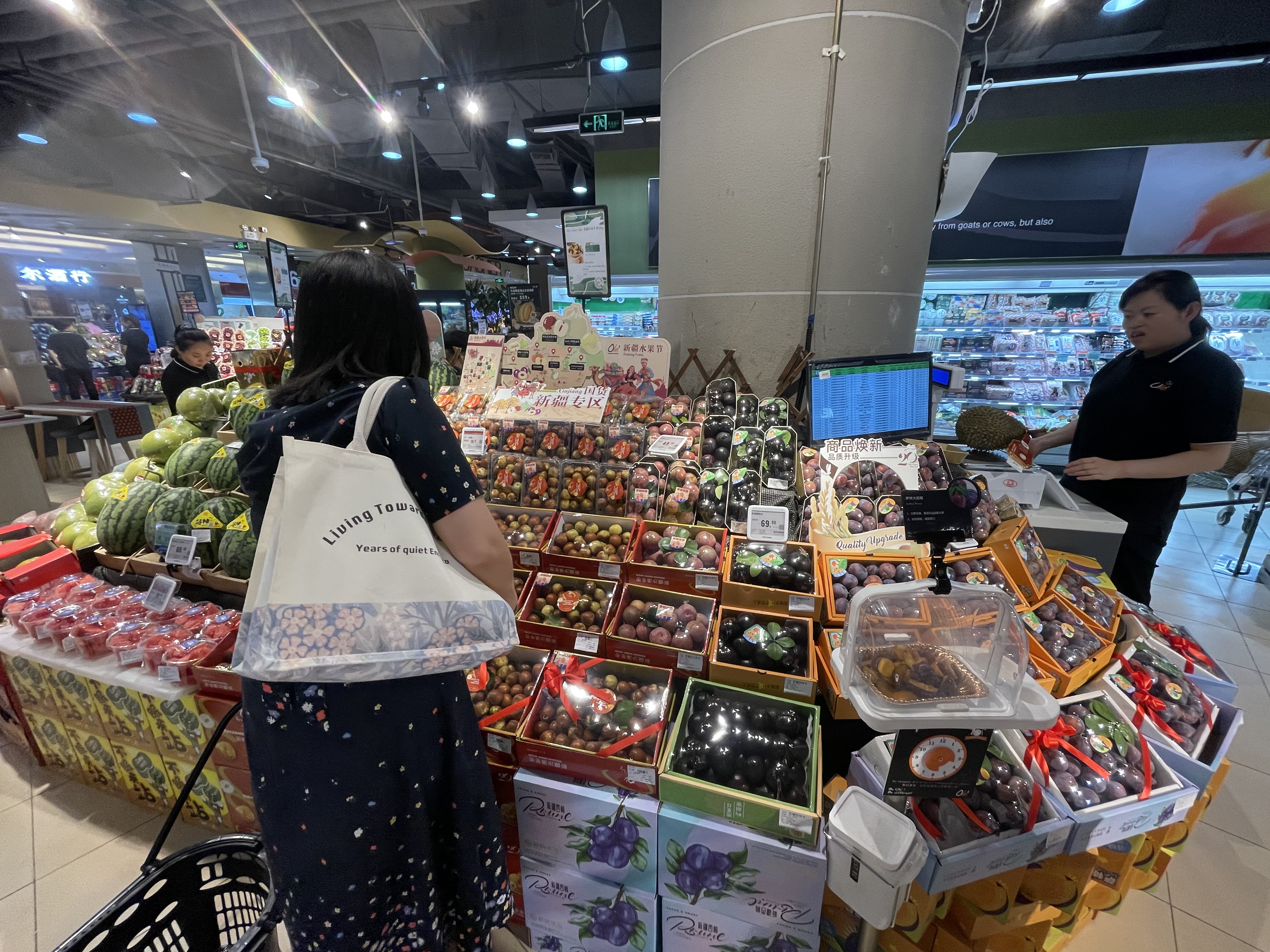 8月29日下午,记者来到Ole精品超市金融街店,水果区中央,一个印有“新疆专区”字样海报的堆头格外显眼。来自喀什的萨特大西梅、阿克苏的恐龙蛋李和沙漠冬枣,琳琅满目的新疆水果,吸引不少消费者前来选购。