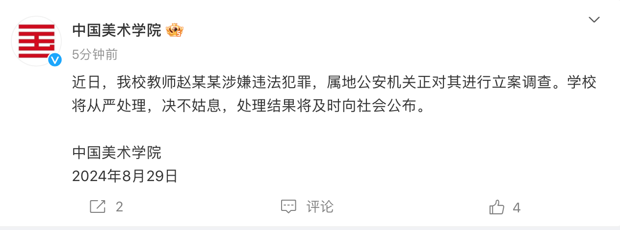 据@中国美术学院消息,近日,我校教师赵某某涉嫌违法犯罪,属地公安机关正对其进行立案调查。学校将从严处理,决不姑息,处理结果将及时向社会公布。