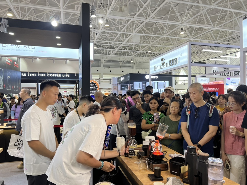 “欢迎品尝,都是刚手冲的咖啡!”来自广州番禺的青烘咖啡店店员热情招呼着路过的观众。这是她们第一次来北京参展,此次千里迢迢从广州赶来也希望能和同行相互交流学习,店员说:“展会是个非常好的交流平台,也希望能让更多的人了解我们。”