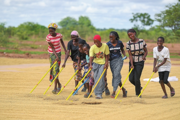 7月19日,冈比亚中河区萨普地区,当地村民在空地上晒谷子。