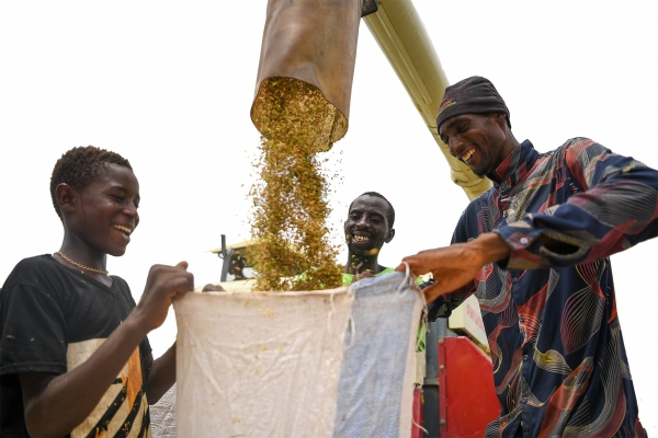 7月19日,冈比亚中河区萨普地区,当地村民开心地接收从收割机中喷出的稻谷。
