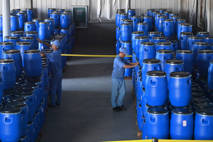 在广西仙草堂制药有限责任公司,工人在搬运青蒿素。(黄孝邦 摄)