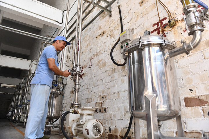 在广西仙草堂制药有限责任公司青蒿素提炼车间,技术人员在作业。(黄孝邦 摄)