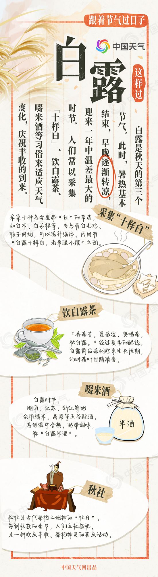 春生夏长,秋收冬藏,跟着节气过日子。今天(9月7日)我国进入秋天的第三个节气——白露。常年此时,北方大部冷空气活动频繁,秋意渐浓,昼夜温差较大;南方则是秋意尚浅,江南等地需防“秋老虎”出没。为适应天气变化、庆祝丰收,民间有采集“十样白”、饮白露茶、啜米酒等习俗。中国天气网特别推出白露风俗图鉴和白露全国天气地图,看看这个节气怎么过。