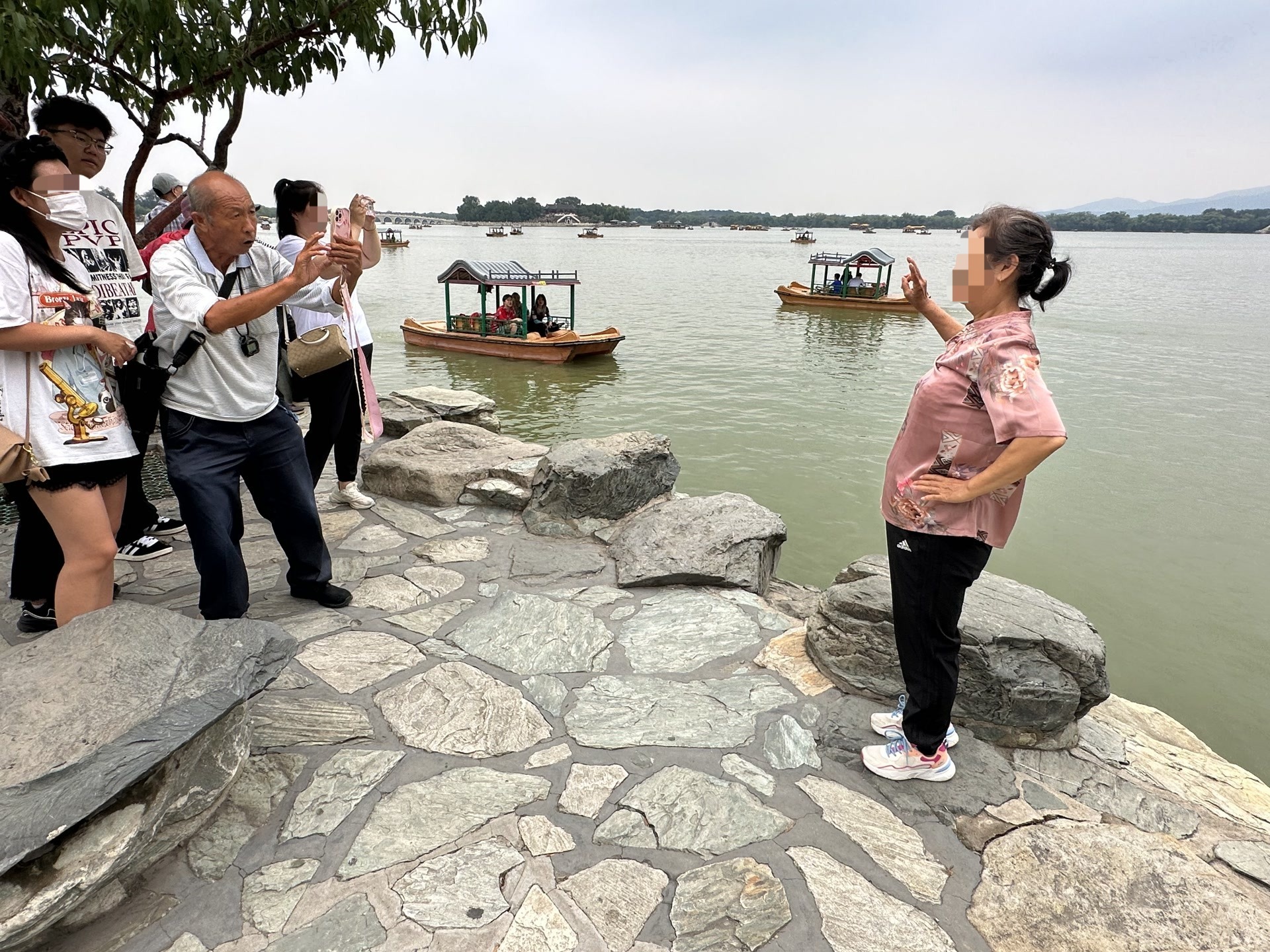 坐了一会,大爷便走向岛上西侧临湖的位置,许多游客正在这里以昆明湖、万寿山和佛香阁为背景拍照。大爷找到一块石头坐定,环顾四周后又起身,沿着湖岸转悠。“您这么拍不成,得这么拍。”见一家人正在拍照,大爷便主动上前指导了起来,“身子稍微侧侧,这手搭她肩,这手叉腰。”“别整个站在这块石头上,太高了不好看,显得佛香阁矮了”……指导游客站定后,大爷拿过对方的手机,严肃认真地喊着“别动!看我”,然后接连按下拍照键。