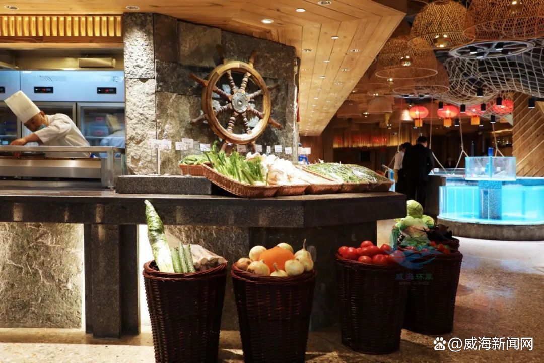 走进“望海潮·威海菜馆”,全木质装修让烟火气扑面而来,渔船造型的食材展柜,以渔笼渔网为装饰的顶棚设计,古典中式风格融入浓厚的胶东渔家风情。