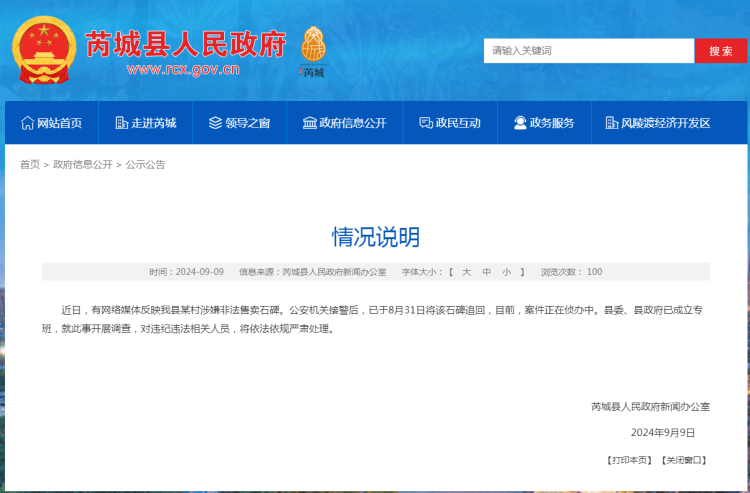 2024年9月9日,芮城县人民政府新闻办公室消息,近日,有网络媒体反映我县某村涉嫌非法售卖石碑。公安机关接警后,已于8月31日将该石碑追回,目前,案件正在侦办中。县委、县政府已成立专班,就此事开展调查,对违纪违法相关人员,将依法依规严肃处理。