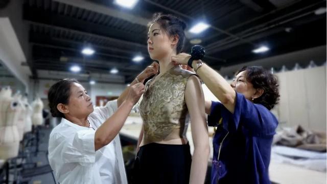 李薇(左)联手工艺师攻克技术难题,精心打造生动唯美的手工艺礼服