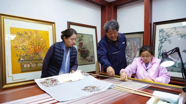 李薇(左一)与江苏省丝绸织造技艺大师李德喜夫妻二人用心织布