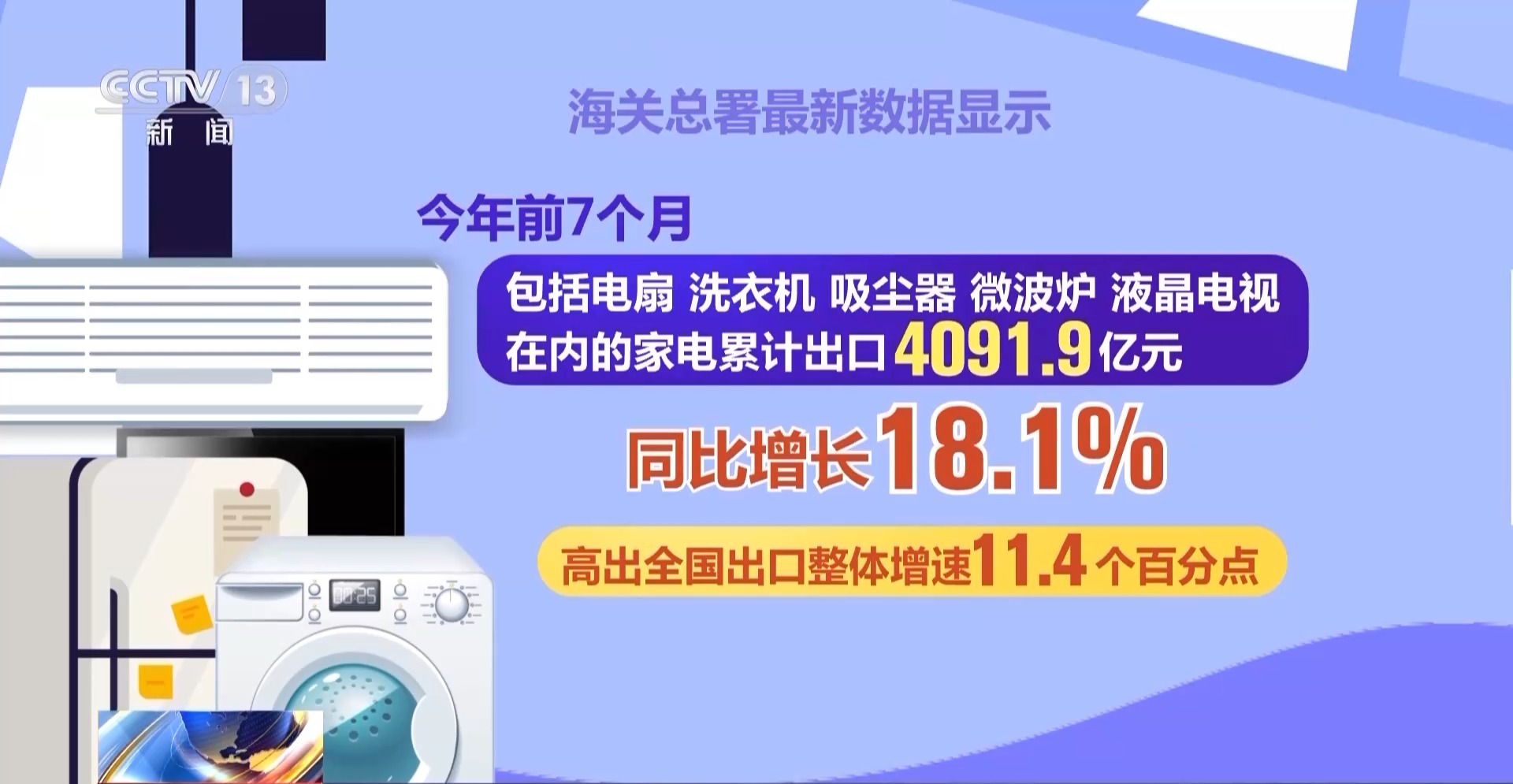 海关总署最新数据显示,今年前7个月,包括电扇、洗衣机、吸尘器、微波炉、液晶电视在内的家电累计出口4091.9亿元,同比增长18.1%,高出全国出口整体增速11.4个百分点。