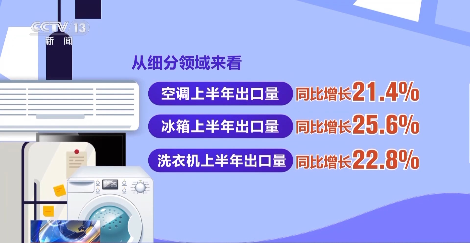 中国机电产品进出口商会家电分会秘书长 周南:今年上半年小家电的出口也明显回暖。从一季度以来,欧美市场库存情况转好,我们企业抓住市场机遇,加大开拓力度。