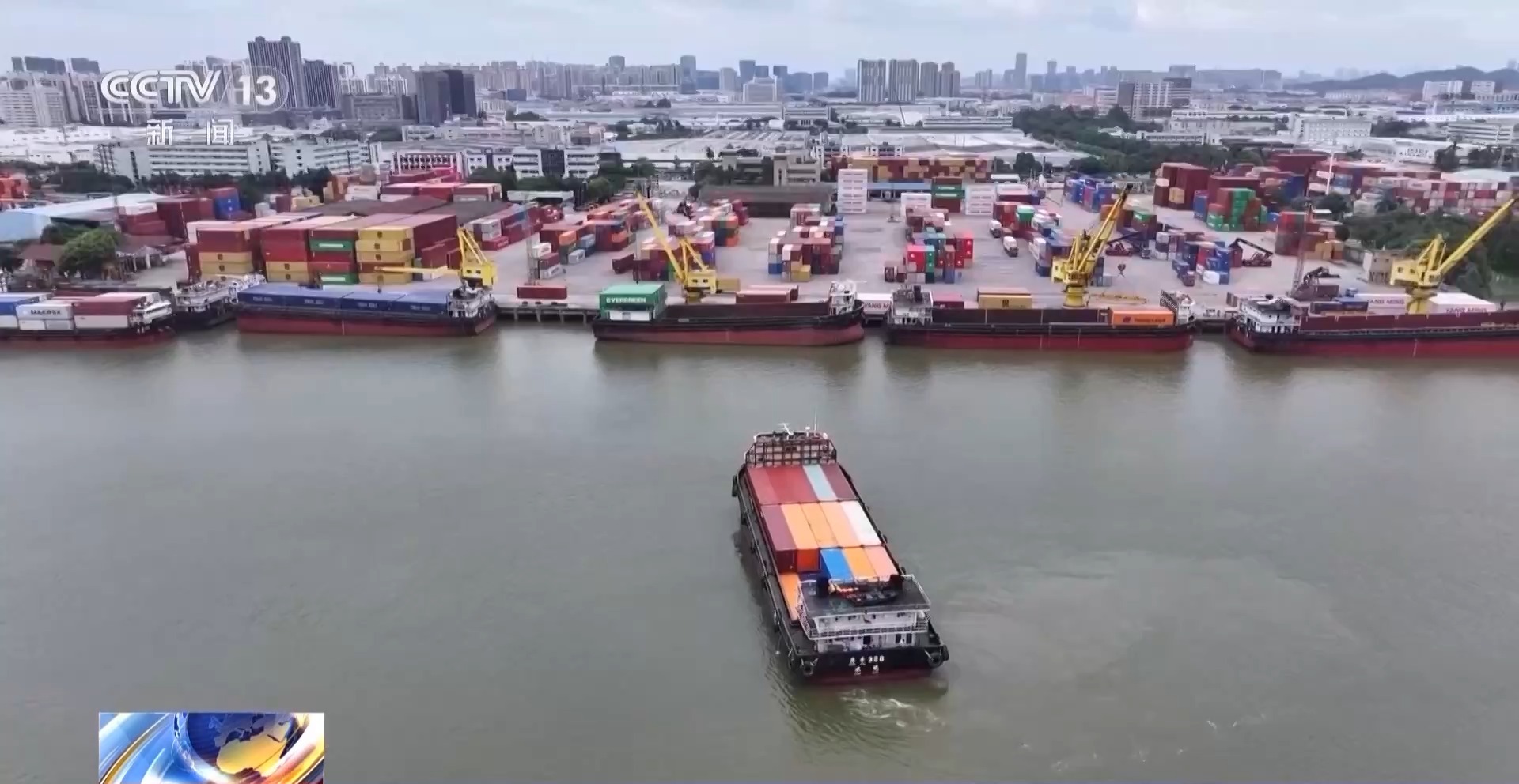 在广东顺德码头,3000余件空调正在装上“丰年598”接驳船。在抵达南沙港后,这批空调将换乘国际货轮运往美国、哥伦比亚、日本等国家和地区。