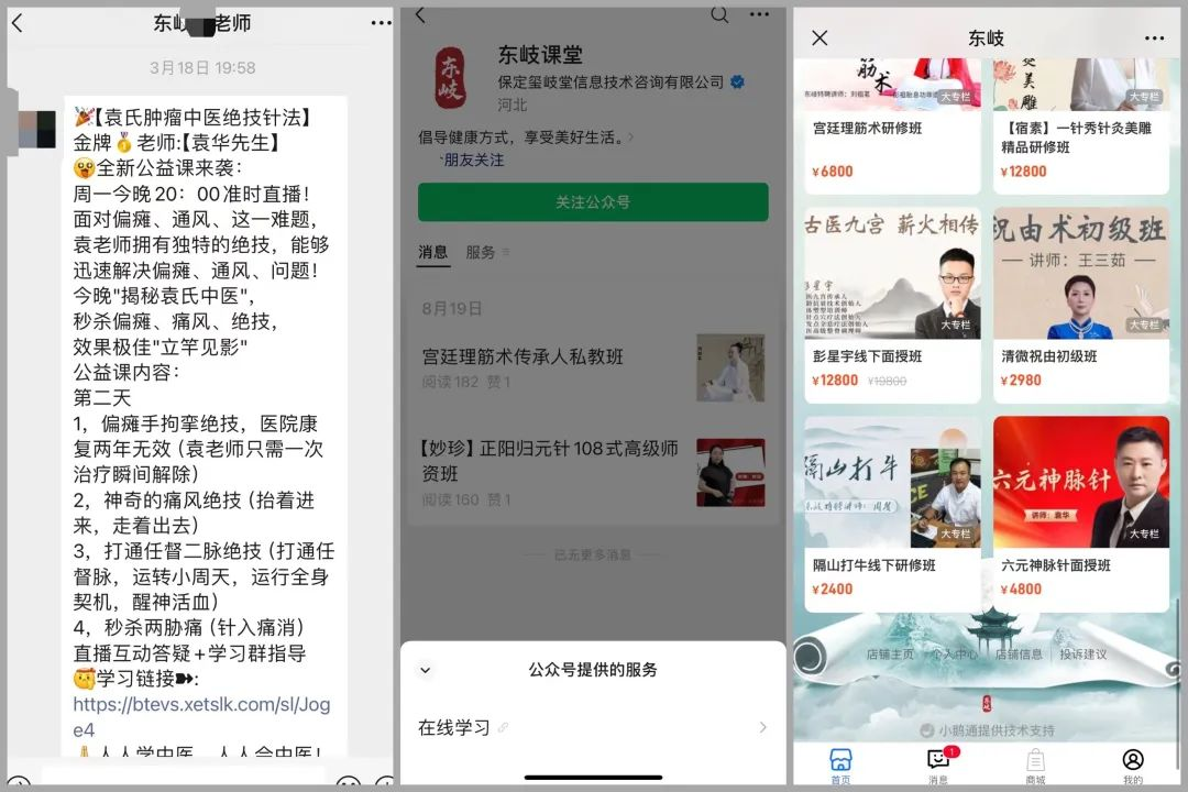 “神医”另辟蹊径,又开始作妖了。据澎湃新闻报道,在“小鹅通”平台上,不少专门售卖中医培训课程的线上知识店铺,充斥着所谓的“神医”和“神奇疗法”,号称可以“一针治癌”、“念数字治万病”,有学员花199元听网课后便“月赚7万”,以此引诱用户购买网课,线下面授课程动辄数千元乃至数万元。