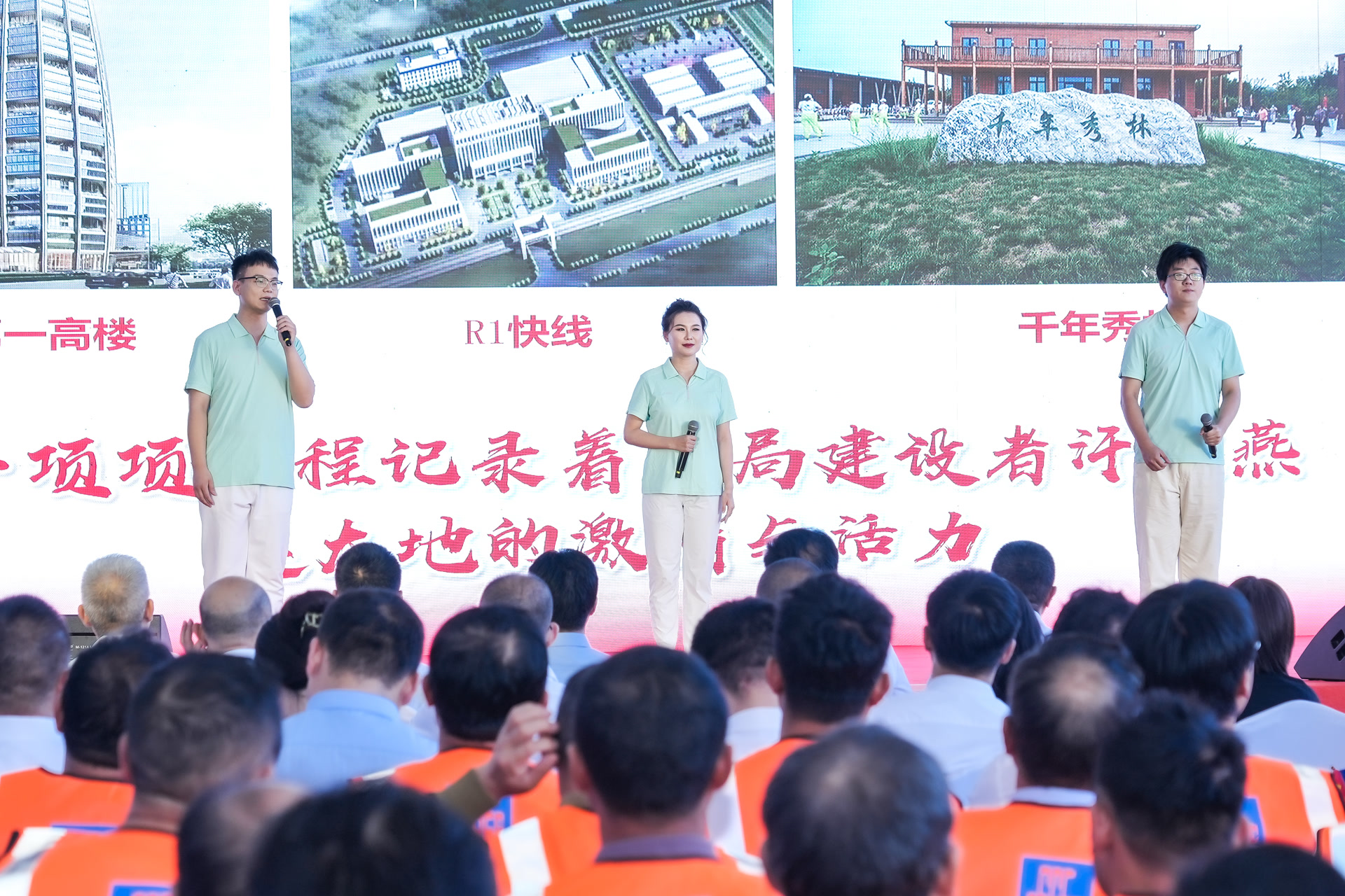 现场,乐器伴奏朗诵《建设新中国 永远跟党走》、合唱《你胸前的奖章告诉我》涌动着员工激情活力。三公司职工护航双奥事迹分享,讲述了中建职工的“奥林匹克”故事;中建二局十佳职业道德模范唐华宣讲“小而美”的暖心工程故事,彰显中建二局“守初心,建人民满意工程”的理念。