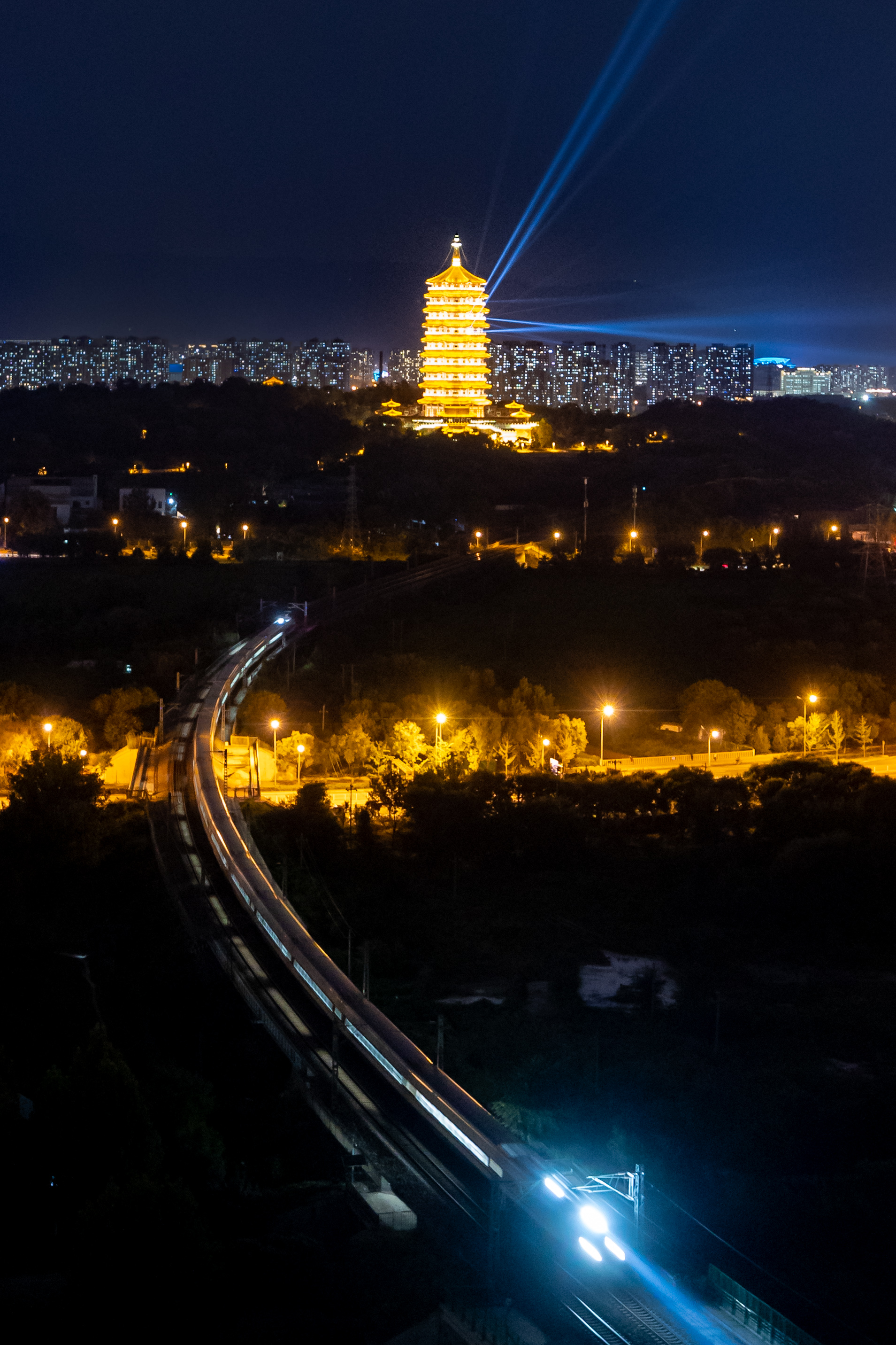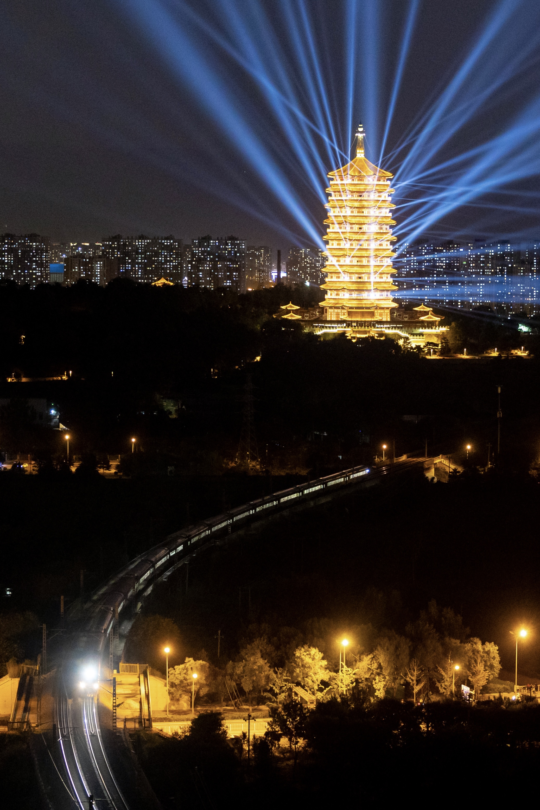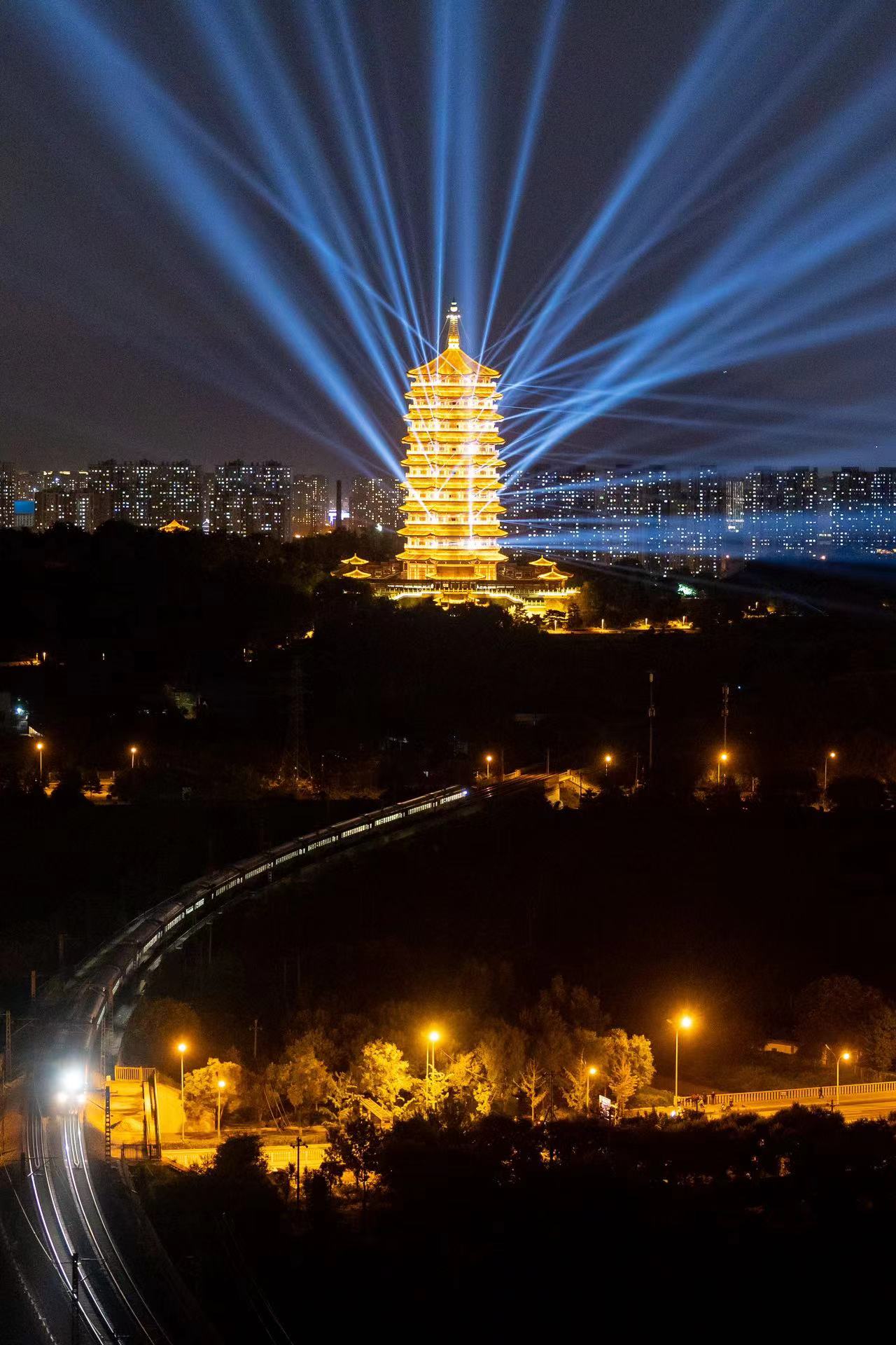 距离2024年中秋国庆京彩灯会倒计时1天。9月13日晚,记者提前来到园博园周边进行探访。夜幕下,永定塔进行点亮、灯光秀表演最终测试。测试进行时,一列火车经过,在斑斓璀璨的灯光下与永定塔一同展现出与众不同的魅力。