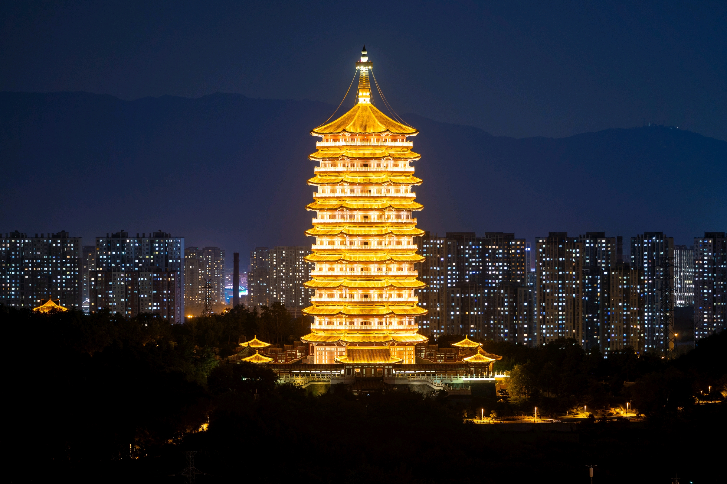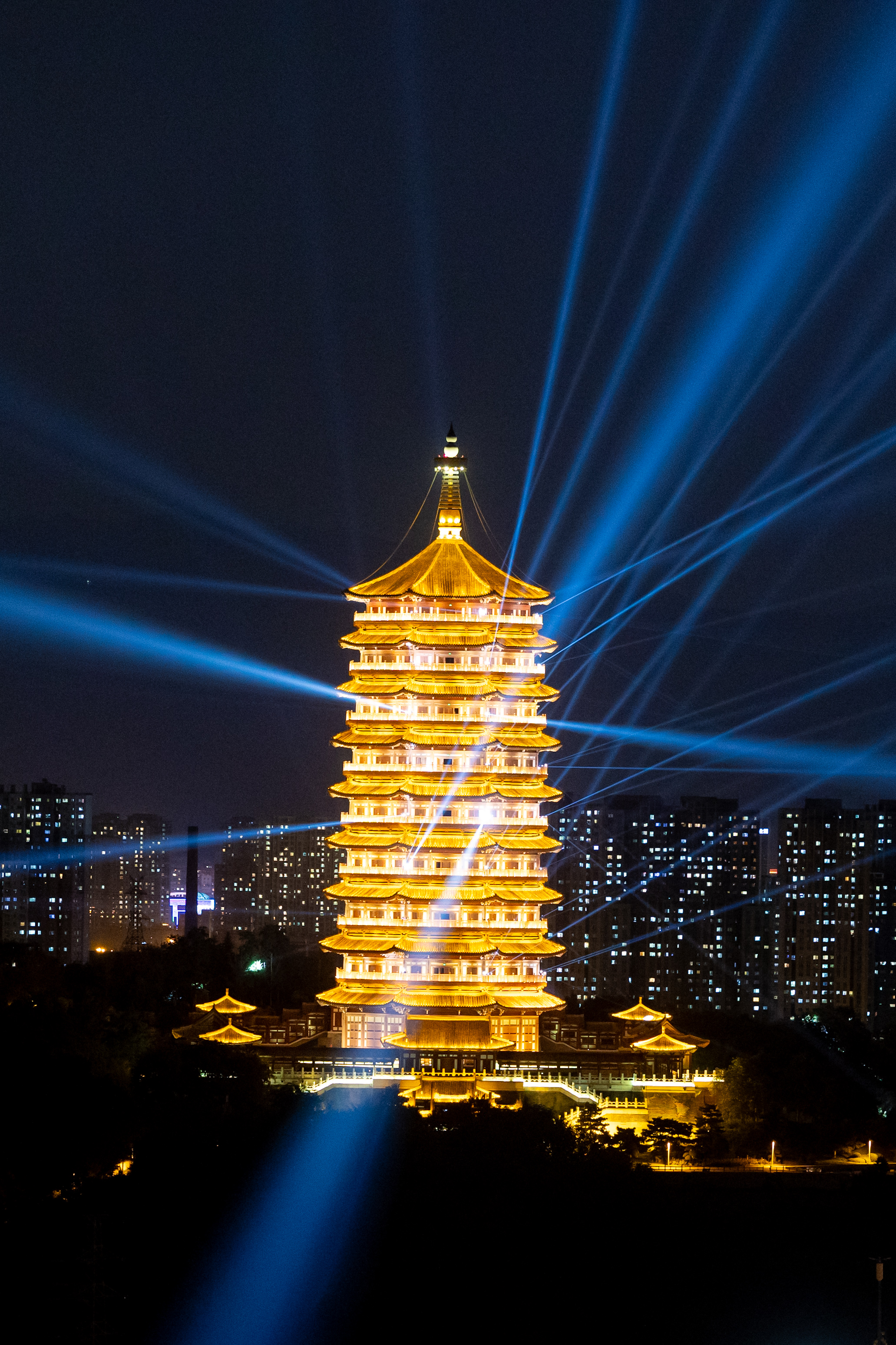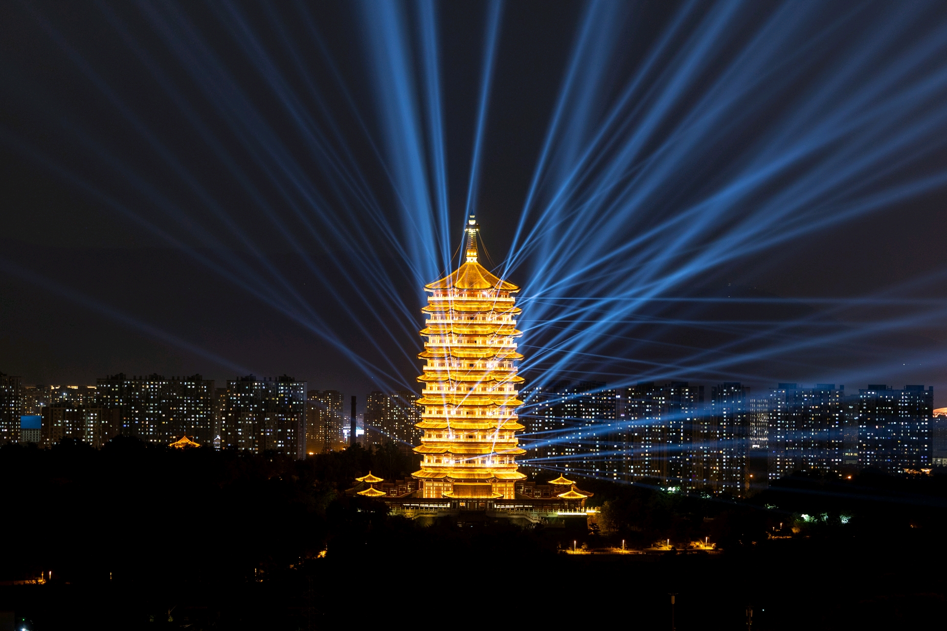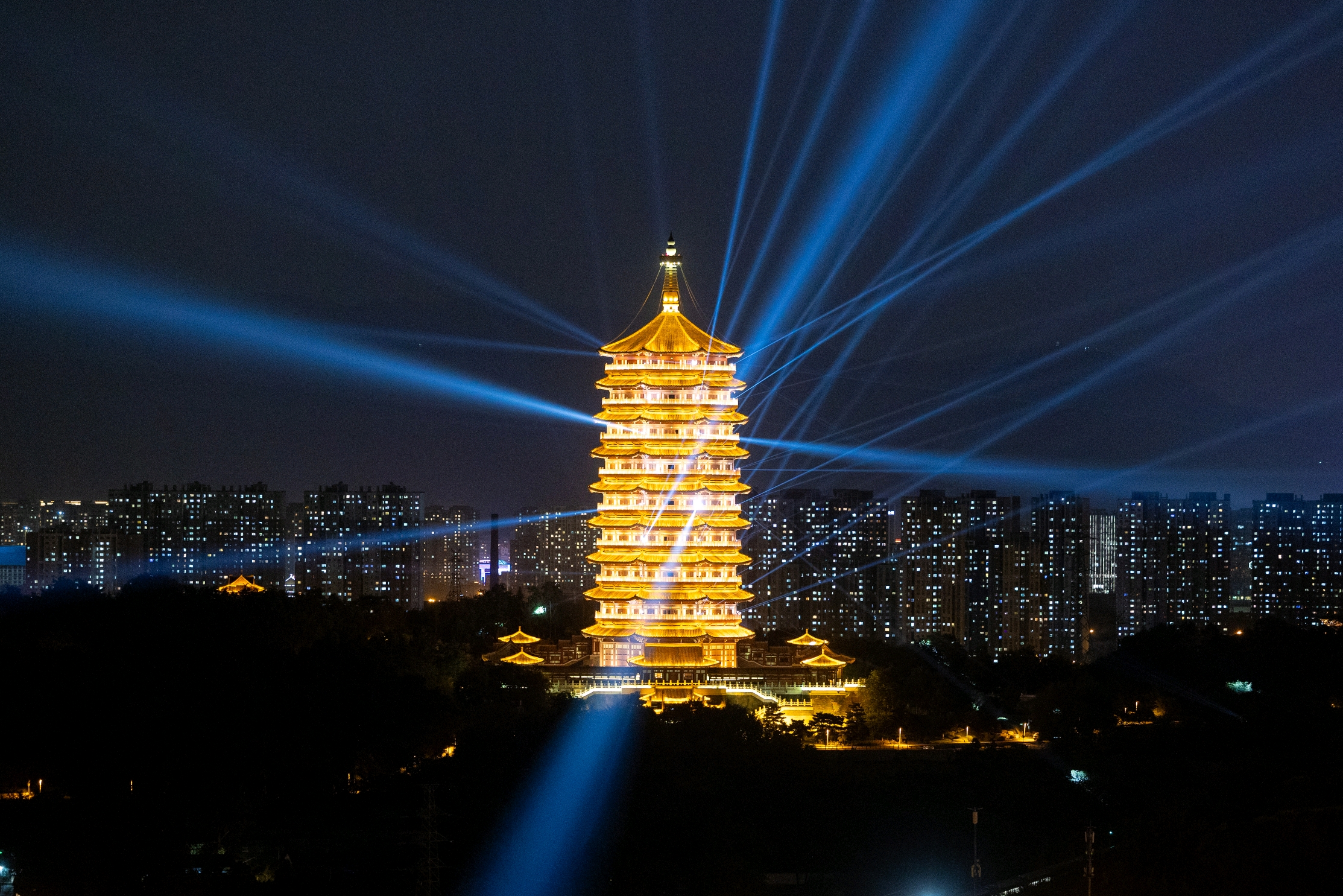 距离2024年中秋国庆京彩灯会倒计时1天。9月13日晚,记者提前来到园博园周边进行探访。夜幕下,永定塔进行点亮、灯光秀表演最终测试。测试进行时,一列火车经过,在斑斓璀璨的灯光下与永定塔一同展现出与众不同的魅力。