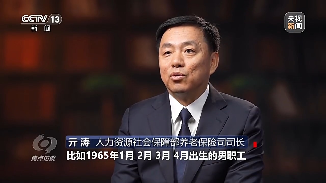 人力资源社会保障部养老保险司司长 亓涛:举个例子,比如1965年1月、2月、3月、4月出生的男职工,如果不改革,可以在明年的1月、2月、3月、4月份退休,改革以后,他的退休年龄会相应延迟一个月,变成明年的2月、3月、4月、5月。1965年5月、6月、7月、8月这四个月出生的男职工,改革以后退休的时间会延迟2个月,变成明年的7月、8月、9月、10月,这样他们的法定退休年龄就提高到60岁零2个月,以此类推。
