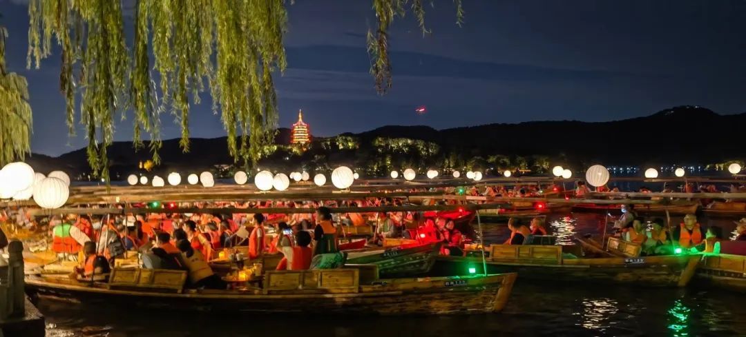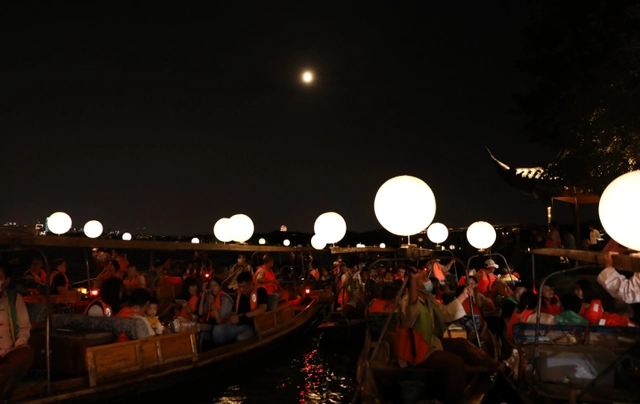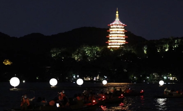 中秋夜人们在“三潭印月”3座石塔里点上灯烛