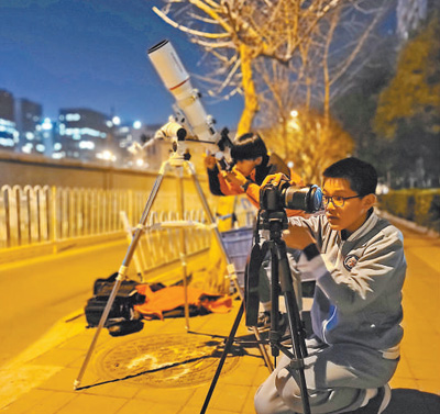 北京市第八中学南斗天文社同学在路边观测。王文智摄(人民视觉)