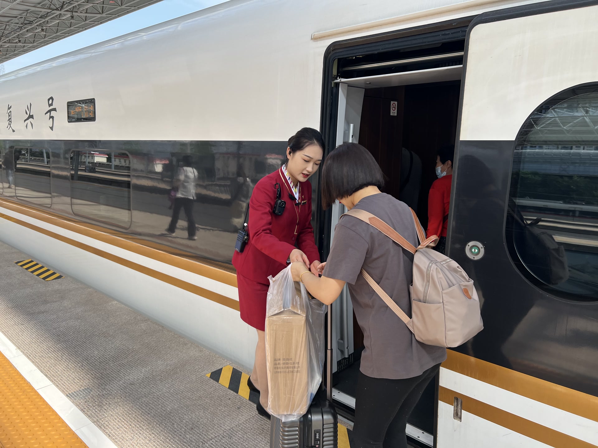 “今天上下车的旅客非常多,许多旅客带着礼品,行李也会比平常多,而且又着急赶车,我们除了维护车上秩序,还会帮助旅客提拿行李、码放行李、引导旅客快速找到座位。”看到手里拎着大包小包着急上车的李先生,张宏杰接过旅客手里的行李,“您先上车,这包东西我帮您拎着。”在车门即将关上前,李先生上了车,虽然气喘吁吁,但嘴里还是一声声表达着感谢。