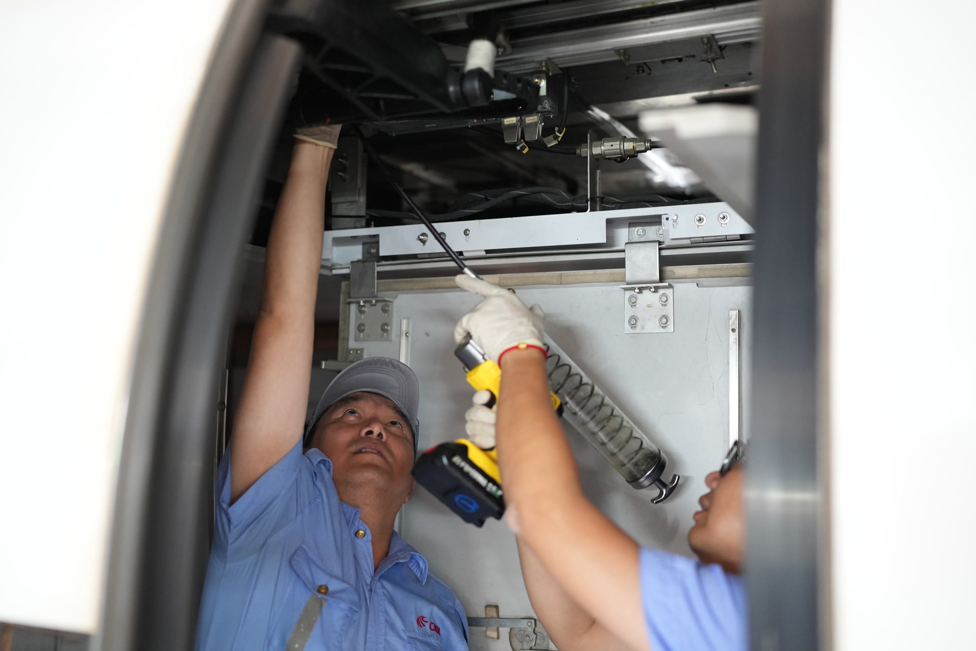 从门的上方开始,按照检修流程,他们有时抬头检查,有时候需要弯下腰,有时候需要将手伸进狭窄的缝隙。检查过程中他们二人基本没有语言交流,多年的配合让他们彼此通过眼神就能确定要做什么。王宾表示,如果动车组车门出现问题,会直接影响旅客上下车安全和列车到发时间,他们必须确保每一列动车组车门功能状态安全可靠,不能有任何懈怠。