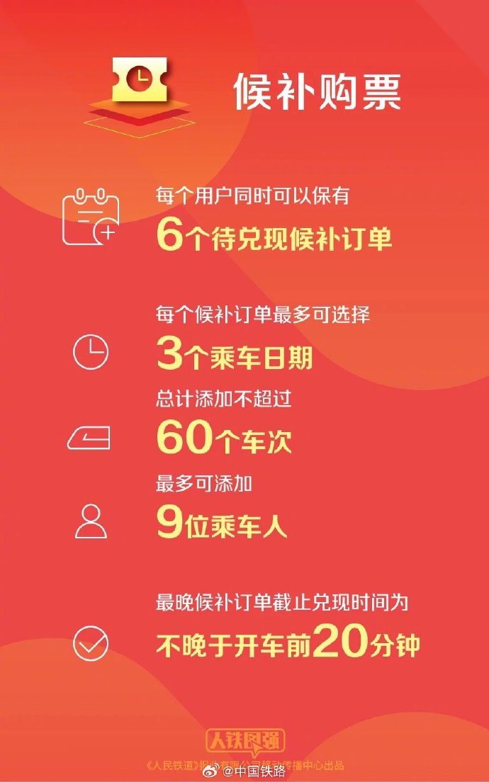 ③候补购票每个用户可以有6个待兑现候补订单,每个候补订单最多可选择3个乘车日期,总计添加不超过60个车次。