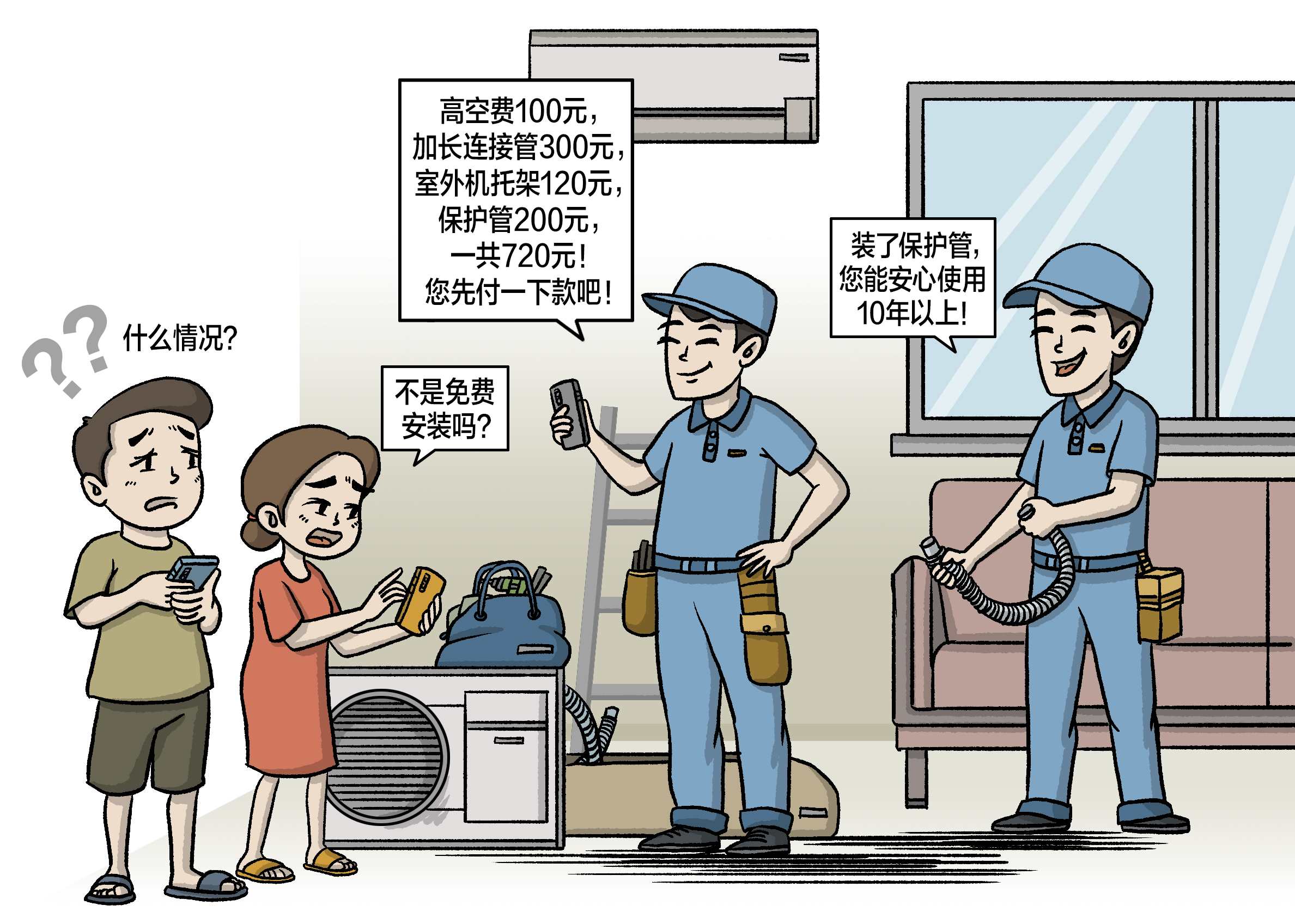 “最让我生气的就是这个保护管。安装工人说空调装在阳面,怕晒,最好用保护管,10块钱一个。我以为就用一两个,结果用了20个。”这1060元的安装费,足够买一台崭新的空调了。