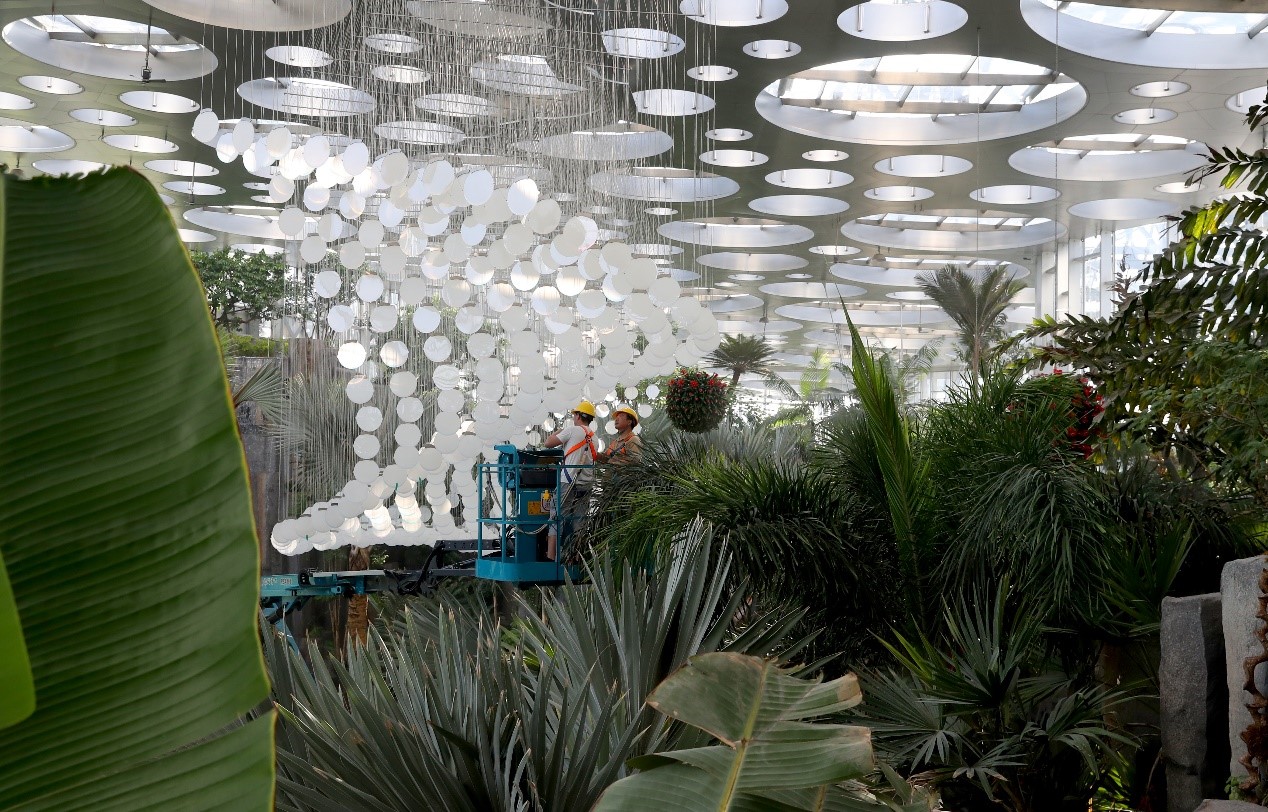 图为工作人员在上海温室花园云雾峡谷展区内进行安装作业。新华社记者 方喆摄