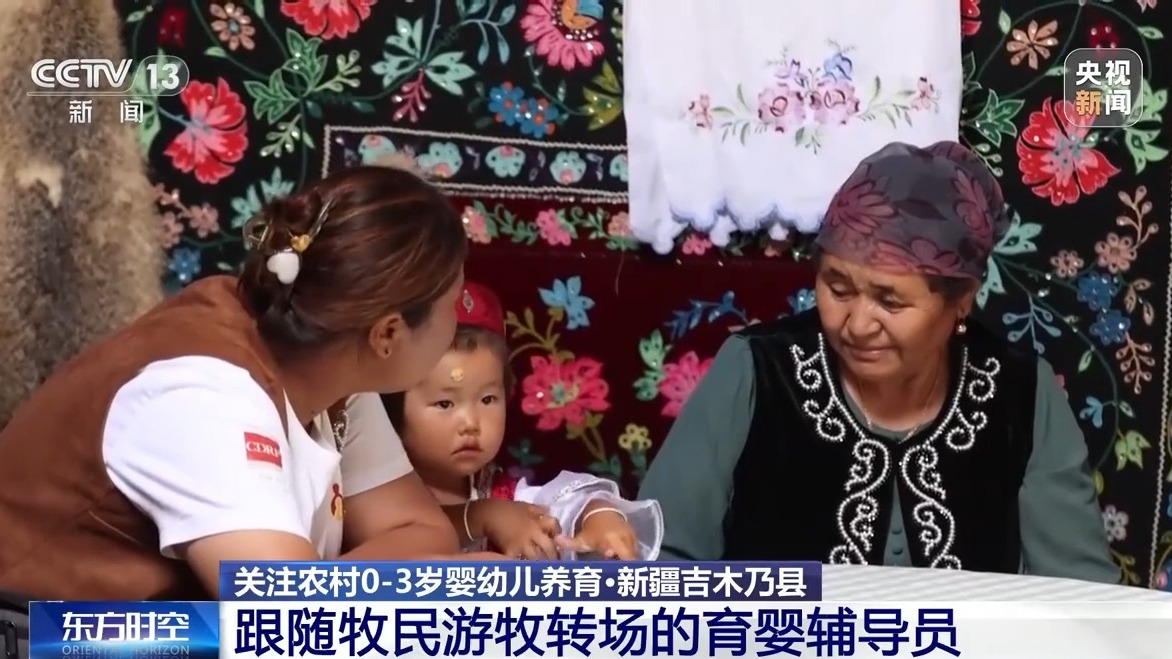 这里是新疆吉木乃县的喀尔交镇牧场,每年这个季节一些哈萨克牧民都会赶着牛羊逐水草而居来到这里,经过一段时间后再迁徙到冬牧场。夏牧场里分散居住着800多人,最多的时候这里有26个0到3岁的婴幼儿跟随家长一路前行。育婴辅导员努尔古丽是这个地区唯一的家访员,她的工作就是为哈萨克牧民0到3岁的孩子上门进行科学养育指导。