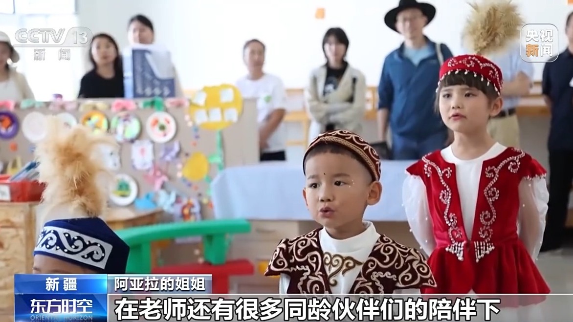 阿亚拉的姐姐:妈妈说在上幼儿园之前,她一直跟父母待在草原和牧业上,所以同龄人特别少,她的性格就比较腼腆,然后胆小。上了幼儿园以后,在老师还有很多同龄伙伴们的陪伴下,她的性格变得越来越开朗、大胆、勇敢。