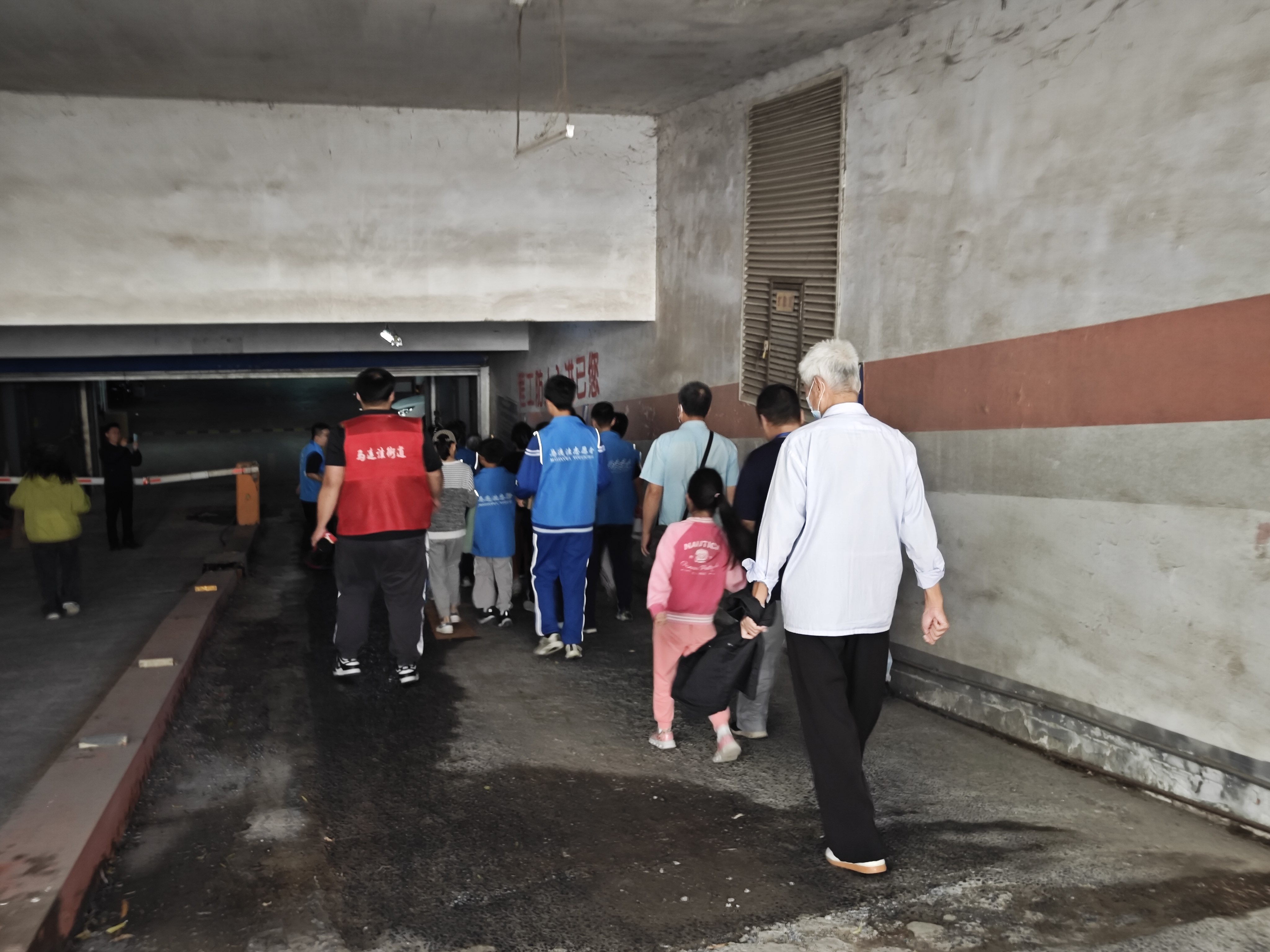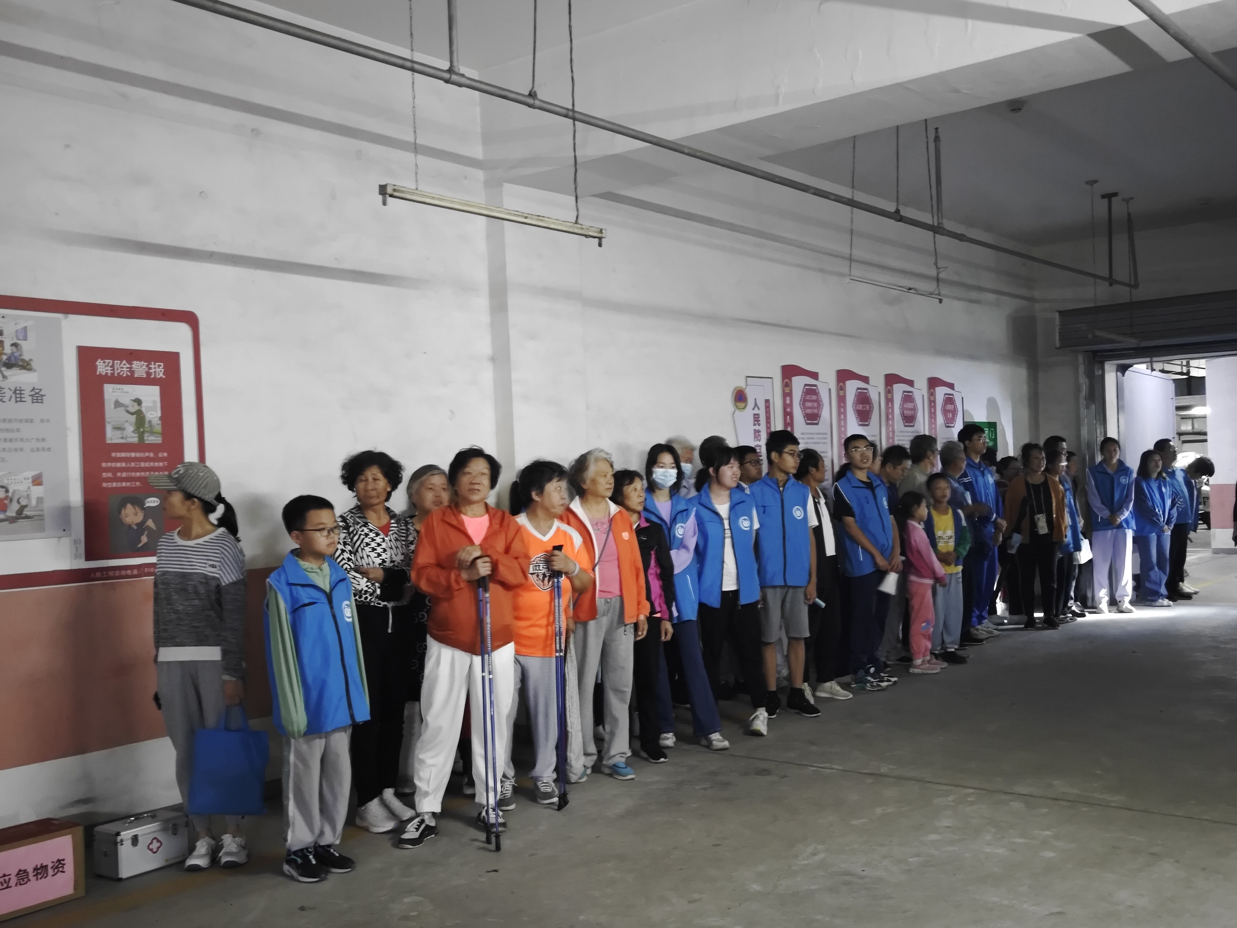 “防空警报响起,大家不要慌张,下楼梯时靠墙一侧撤离,不要拥挤……”上午10时至10时23分,按照“预先警报”“空袭警报”“解除警报”的顺序,防空警报依次鸣响。在社区工作人员的引导下,居民们迅速反应,开始从居委会撤离。大家带着应急物资,孩子们紧紧抓住父母的手,年轻人守护在老人身旁。短短几分钟,所有参与者都井然有序地撤离到了三四百米外的人防区域中。