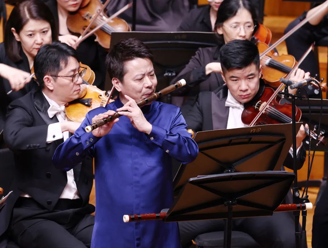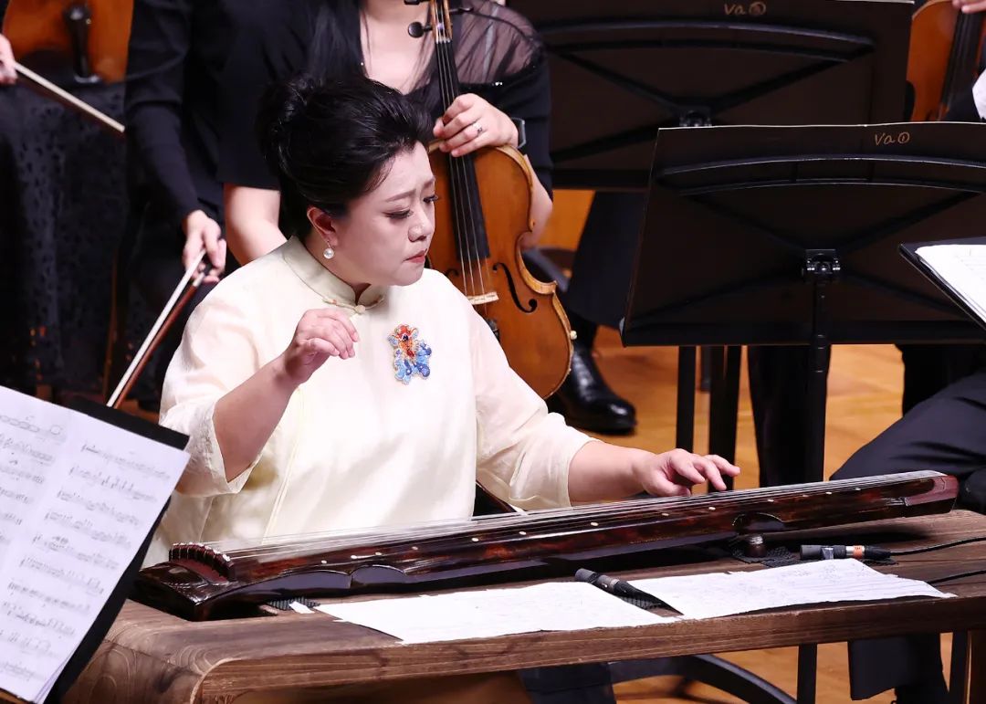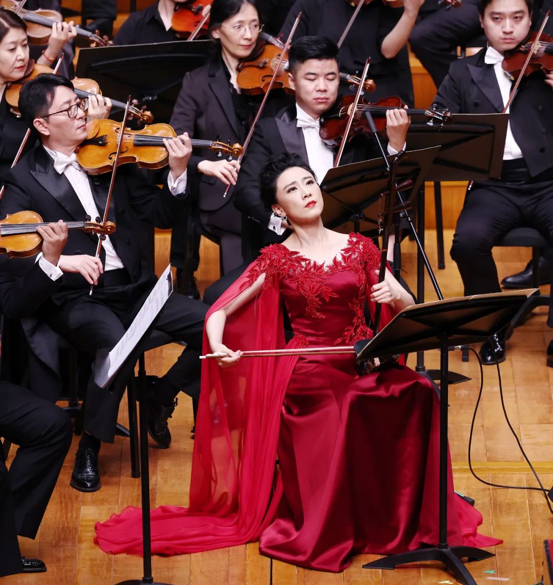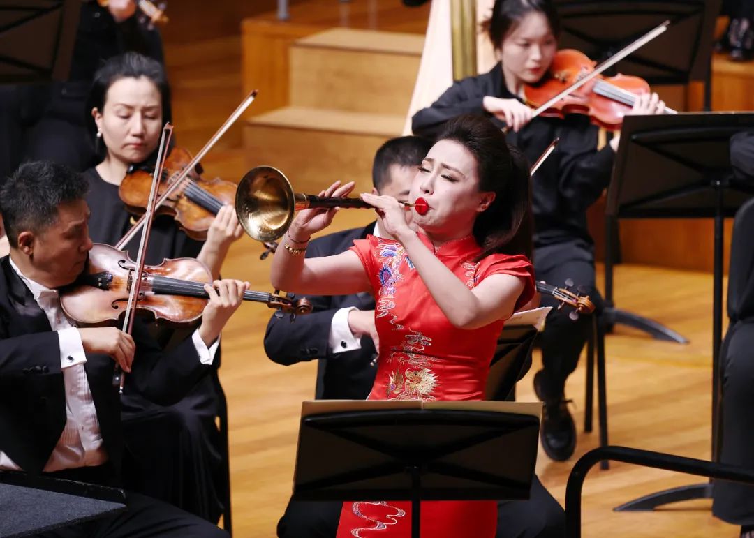 第二乐章“百年夙愿”中,二胡如歌般的旋律缓缓展开,描绘出中华民族为实现夙愿而历经的百年奋斗。整个乐章中,二胡数次以极富民间情趣的“抑扬格”开始陈述,最终形成连绵的线条贯穿始终。二胡的音色既充满柔情,又带有力量,通过丰富的滑音与连奏,展现出历史的绵延感和情感的层次性。二胡不仅承接了第一乐章古琴的悠远音色,象征历史的延续,还通过旋律的递进为后续乐章铺垫了情感的高潮。