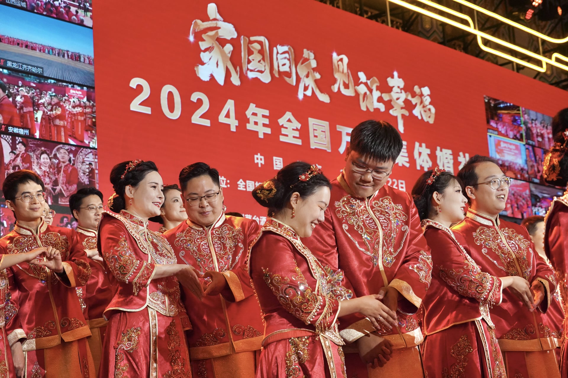 凤冠霞帔、婚书纸媒、共结良缘、比翼双飞!9月22日,“家国同庆,见证幸福”2024年全国万人集体婚礼在全国50个会场同时举行,全国5000对1万名新人同一时刻许下幸福誓言,喜迎新中国75周年华诞。