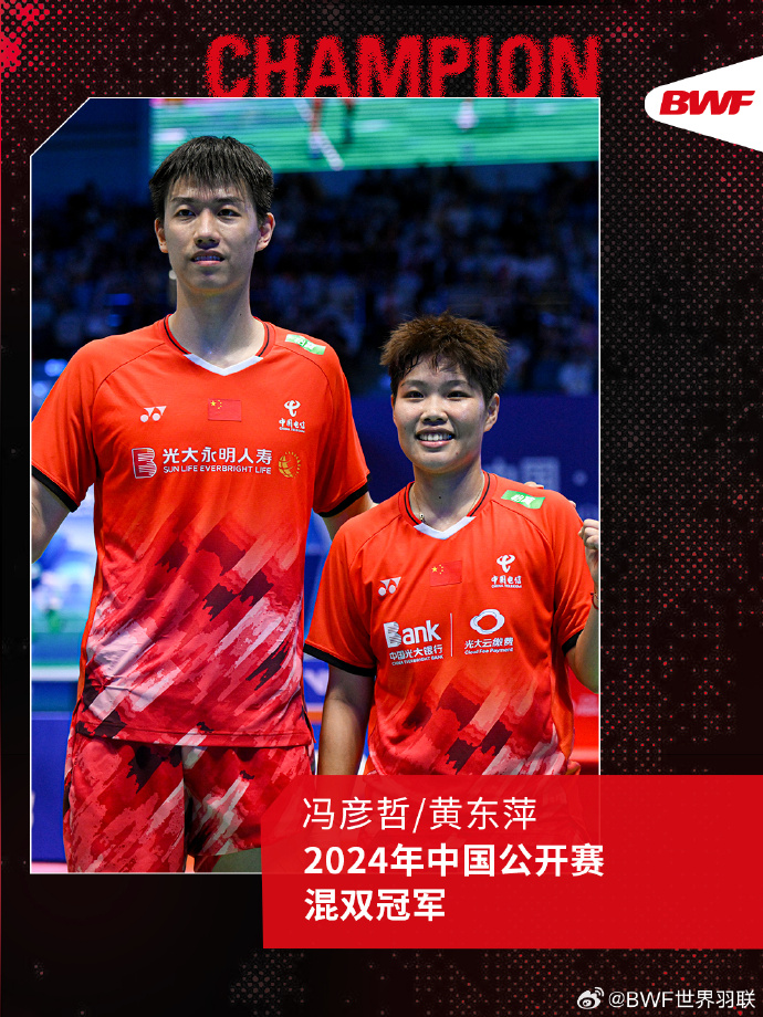 恭喜冯彦哲/黄东萍夺得2024年中国公开赛混双冠军!恭喜吴埙阀/赖洁敏获得混双亚军!