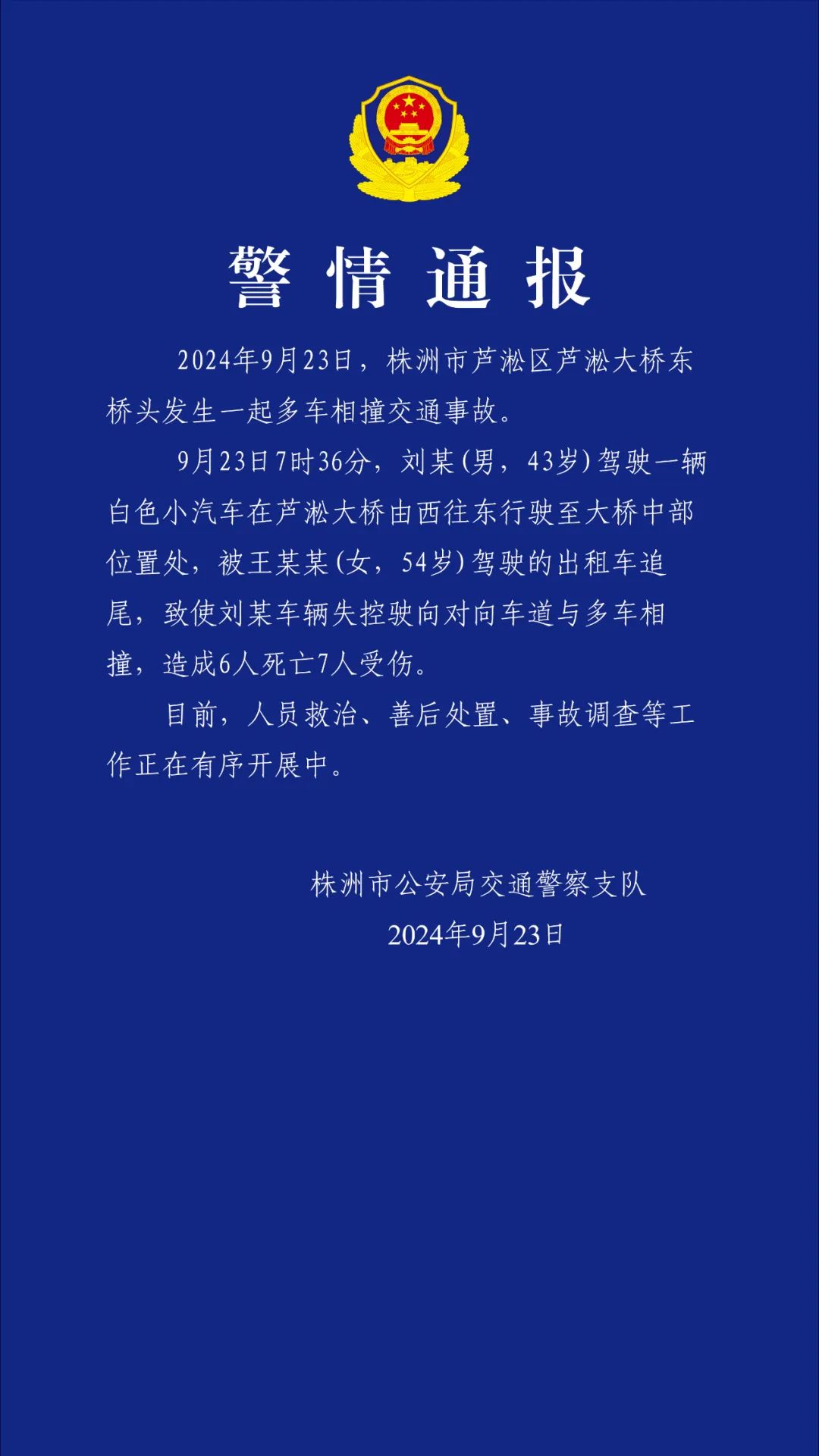 9月23日7时36分,刘某(男,43岁)驾驶一辆白色小汽车在芦淞大桥由西往东行驶至大桥中部位置处,被王某某(女,54岁)驾驶的出租车追尾,致使刘某车辆失控驶向对向车道与多车相撞,造成6人死亡7人受伤。