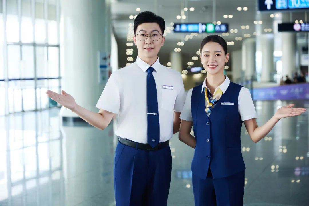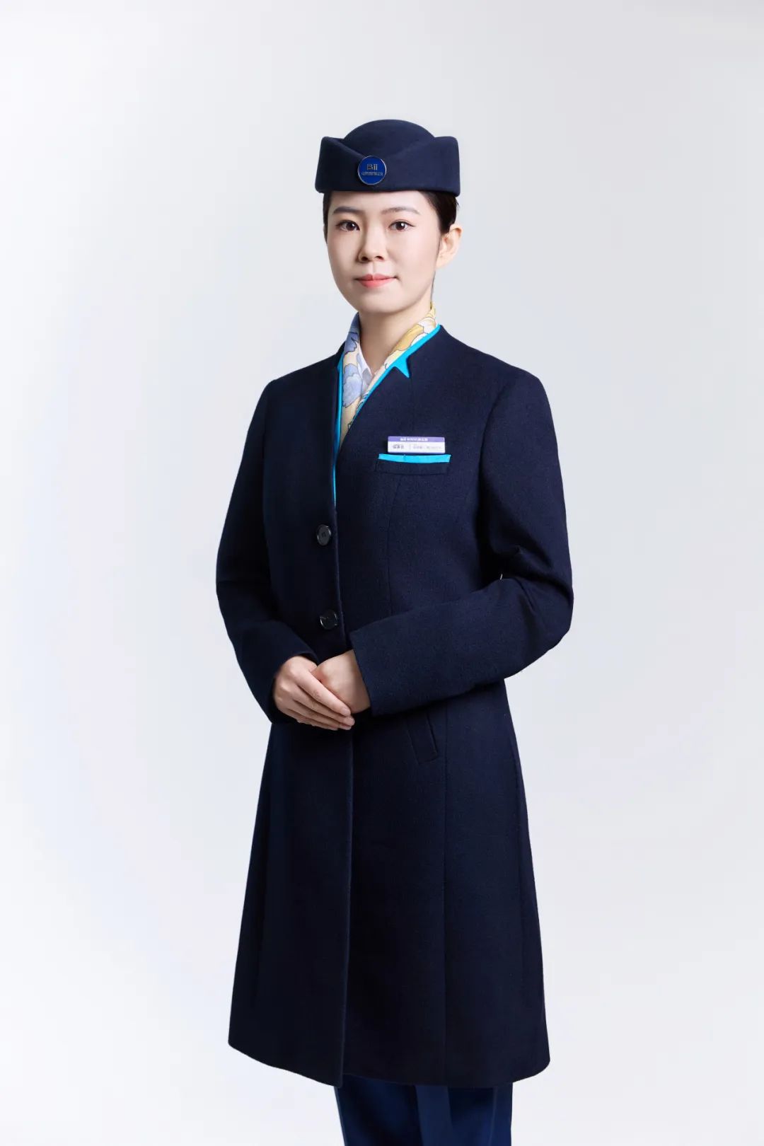 女款采用了连领式样、一粒扣的设计,日常佩戴空姐帽与头花,丝巾图案融合牡丹、城市地标及公司元素,创新采用钻石结系法,美观大方。