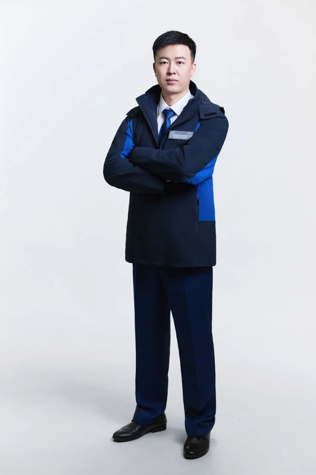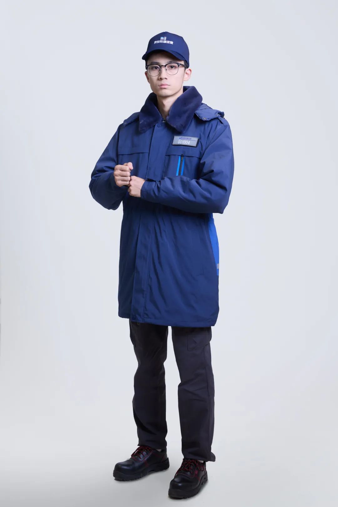 为适应维保岗位工作环境特点,冬季棉服面料全面升级,更佳挺括不易皱,防风性更强,采用短款设计,便于活动,并在下摆两侧设计开叉,提升穿着活动性和舒适性,并增加内胆厚度和长度,保暖性更佳。胸兜采用男左女右设计,增加背部反光条,提升光线不足环境中的安全性。短款棉大衣为维保、综合岗位通用款式。