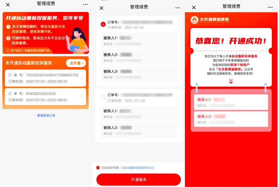 “北京普惠健康保”项目组相关负责人介绍,开通自动重新投保服务的流程需简单三步: